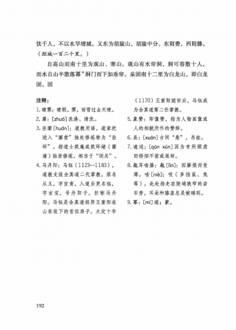 %u996e%u5343%u4eba%uff0c%u4e0d%u4ee5%u6c34%u65f1%u589e%u51cf%u3002%u53c8%u4e1c%u4e3a%u80e1%u9675%u5c71%uff0c%u80e1%u9675%u4e2d%u5206%uff0c%u4e1c%u5219%u8d39%uff0c%u897f%u5219%u6ed5%u3002 (%u8ddd%u57ce%u4e00%u767e%u4e8c%u5341%u91cc%u3002 %uff09%u81ea%u9ad8%u5c71%u800c%u5357%u5341%u91cc%u4e3a%u89c2%u5c71%u3001%u5bd2%u5c71%u3002%u89c2%u5c71%u6709%u6c34%u5e18%u6d1e%uff0c%u6d1e%u53ef%u5bb9%u6570%u5341%u4eba%uff0c %u800c%u6c34%u81ea%u5c71%u534a%u6563%u843d%u51aa 9%u6d1e%u95e8%u800c%u4e0b%u5982%u5782%u5e18%u3002%u6cc9%u56fa%u5357%u5341%u4e8c%u91cc%u4e3a%u767d%u9f99%u5c71%uff0c%u5373%u767d%u9f99%u56fa%u3002%u56fa%u6ce8%u91ca%uff1a1. %u6674%u9701%uff1a%u6674%u6717%u3002%u9701%uff0c%u96e8%u96ea%u8fc7%u53bb%u5929%u6674%u30022. %u704c%uff1a[zhu6]%u6d17%u6da4%u3001%u6e05%u6d17%u30023. %u5750%u571c[hudn] : %u9053%u6559%u7528%u8bed%uff0c%u9053%u5bb6%u628a %u8fdb %u5165 %u201c%u571c%u5802%u201d%u72ec%u5904%u4fee%u70bc%u79f0%u4e3a%u201c%u5750 %u73af%u201d%uff0c%u6307%u9053%u58eb%u7b51%u5eb5%u6216%u7b51%u73af%u5835%uff08%u571c %u5835 %uff09%u72ec%u5c45%u4fee%u70bc%uff0c%u76f8%u5f53%u4e8e%u201c%u95ed%u5173%u201d%u30024. %u9a6c%u4e39%u9633%uff1a%u9a6c %u94b0 %uff08 1123%u2014 1 1 8 3 )%uff0c %u9053%u6559%u652f%u6d3e%u5168%u771f%u9053%u4e8c%u4ee3%u638c%u6559%uff0c%u539f%u540d %u4ece%u4e49%uff0c%u5b57%u5b9c%u752b%uff0c%u5165%u9053%u540e%u66f4%u540d%u94b0%uff0c %u5b57%u7384%u5b9d%uff0c%u53f7%u4e39%u9633%u5b50%uff0c%u4e16%u79f0%u9a6c%u4e39 %u9633%u3002%u9a6c%u94b0%u662f%u5168%u771f%u9053%u7956%u5e08%u738b%u91cd%u9633%u5728 %u5c71%u4e1c%u6536%u4e0b%u7684%u9996%u4f4d%u5f1f%u5b50%u3002%u5927%u5b9a%u5341%u5e74( 1 1 7 0 )%u738b%u91cd%u9633%u901d%u4e16%u540e%uff0c%u9a6c%u94b0%u6210 %u4e3a%u5168%u771f%u9053%u7b2c%u4e8c%u4efb%u638c%u6559%u30025. %u8c61%u8d5e%uff1a%u5373%u50cf%u8d5e%uff0c%u6307%u4e3a%u4eba%u7269%u753b%u50cf%u6216 %u4eba%u7684%u76f8%u8c8c%u6240%u4f5c%u7684%u8d5e%u8f9e%u30026. %u53bf%uff1a[xudn]%u53e4 %u540c %u201c%u60ac%u201d%uff0c%u540a%u6302%u30027. %u9021%u5de1%uff1a[qOn xiin] %u56e0%u4e3a%u6709%u6240%u987e%u8651 %u800c%u5f98%u5f8a%u4e0d%u524d%u6216%u9000%u5374%u30028. %u74f6%u8033%u556e%u819d%uff1a%u74f6 [Hn]: %u56e0%u78e8%u635f%u800c%u53d8 %u8584%u3002%u556e [nid: %u54ac %uff08%u591a%u6307%u9f20%u3001%u5154 %u7b49 %uff09%u3002%u6b64%u5904%u6307%u8d70%u5728%u9661%u5ced%u72ed%u7a84%u7684%u5ca9 %u77f3%u65c1%uff0c%u8033%u6735%u548c%u819d%u76d6%u603b%u662f%u88ab%u78b0%u5230%u30029 %u51aa%uff1a[m]]%u906e%uff1b%u8499%u3002192