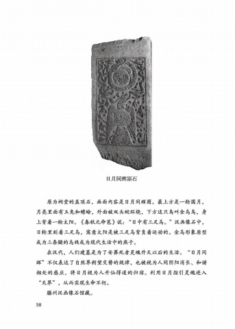 %u65e5%u6708%u540c%u8f89%u539f%u77f3%u539f%u4e3a%u7960%u5802%u7684%u76d6%u9876%u77f3%uff0c%u753b%u9762%u5185%u5bb9%u662f%u65e5%u6708%u540c%u8f89%u56fe%u3002%u6700%u4e0a%u65b9%u662f%u4e00%u8f6e%u5706%u6708%uff0c %u6708%u4eae%u91cc%u9762%u6709%u7389%u5154%u548c%u87fe%u870d%uff0c%u5916%u9762%u88ab%u53cc%u5934%u86c7%u73af%u7ed5%uff0c%u4e0b%u65b9%u8fd9%u53ea%u9e1f%u53eb%u91d1%u4e4c%u9e1f%uff0c%u8eab %u4e0a%u80cc%u7740%u4e00%u8f6e%u592a%u9633%u3002 %u300a%u6625%u79cb%u5143%u547d%u82de%u300b%u8bf4 %uff1a%u201c%u66f0%u4e2d%u6709%u4e09%u8db3%u4e4c%u3002%u201d%u6c49%u753b%u50cf%u77f3%u4e2d%uff0c %u66f0%u8f6e%u91cc%u523b%u7740%u4e09%u8db3%u4e4c%uff0c%u5bd3%u610f%u592a%u9633%u662f%u88ab%u4e09%u8db3%u4e4c%u80cc%u8d1f%u7740%u8fd0%u52a8%u7684%u3002%u91d1%u4e4c%u5f62%u8c61%u539f%u578b %u6216%u4e3a%u4e09%u6761%u817f%u7684%u4e4c%u9e26%u6216%u4e3a%u73b0%u4ee3%u751f%u6d3b%u4e2d%u7684%u71d5%u5b50%u3002%u5728%u6c49%u4ee3%uff0c%u4eba%u4eec%u5efa%u5893%u662f%u4e3a%u4e86%u5b89%u846c%u6b7b%u8005%u7075%u9b42%u5347%u5929%u4ee5%u540e%u7684%u751f%u6d3b%u3002 %u201c%u65e5%u6708%u540c %u8f89%u201d%u4e0d%u4ec5%u8868%u8fbe%u4e86%u81ea%u7136%u754c%u6714%u671b%u4ea4%u66ff%u7684%u89c4%u5f8b%uff0c%u4e5f%u88ab%u89c6%u4e3a%u4eba%u95f4%u9634%u9633%u6d88%u957f%u3001%u548c%u8c10 %u76f8%u5904%u7684%u611f%u5e94%uff0c%u5c06%u65e5%u6708%u89c6%u4e3a%u4eba%u5347%u4ed9%u5f97%u9053%u7684%u5f52%u5bbf%u3002%u5229%u7528%u65e5%u6708%u6307%u5f15%u7075%u9b42%u8fdb%u5165 %u201c%u5929%u754c%u201d%uff0c%u4ece%u800c%u5b9e%u73b0%u751f%u547d%u4e0d%u673d%u3002%u6ed5%u5dde%u6c49%u753b%u50cf%u77f3%u9986%u85cf%u300258