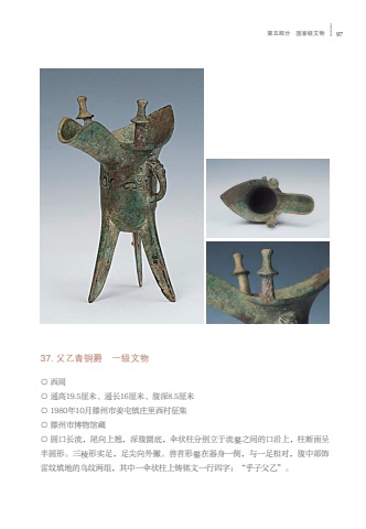 %u7b2c%u4e94%u90e8%u5206 %u56fd%u5bb6%u7ea7%u6587%u7269 9737. %u7236%u4e59%u9752%u94dc%u7235 %u4e00%u7ea7%u6587%u7269%u25cb %u897f%u5468%u25cb %u901a%u9ad819.5%u5398%u7c73%u3001%u901a%u957f16%u5398%u7c73%u3001%u8179%u6df18.5%u5398%u7c73%u25cb 1980%u5e7410%u6708%u6ed5%u5dde%u5e02%u59dc%u5c6f%u9547%u5e84%u91cc%u897f%u6751%u5f81%u96c6%u25cb %u6ed5%u5dde%u5e02%u535a%u7269%u9986%u85cf%u25cb %u5706%u53e3%u957f%u6d41%uff0c%u5c3e%u5411%u4e0a%u7fd8%uff0c%u6df1%u8179%u571c%u5e95%uff0c%u4f1e%u72b6%u67f1%u5206%u522b%u7acb%u4e8e%u6d41%u92ec%u4e4b%u95f4%u7684%u53e3%u6cbf%u4e0a%uff0c%u67f1%u65ad%u9762%u5448%u534a%u5706%u5f62%u3002%u4e09%u7a1c%u5f62%u5b9e%u8db3%uff0c%u8db3%u5c16%u5411%u5916%u6487%u3002%u517d%u9996%u5f62%u92ec%u5728%u5668%u8eab%u4e00%u4fa7%uff0c%u4e0e%u4e00%u8db3%u76f8%u5bf9%uff0c%u8179%u4e2d%u90e8%u9970%u96f7%u7eb9%u586b%u5730%u7684%u9e1f%u7eb9%u4e24%u7ec4%uff0c%u5176%u4e2d%u4e00%u4f1e%u72b6%u67f1%u4e0a%u94f8%u94ed%u6587%u4e00%u884c%u56db%u5b57%uff1a%u201c%u4e4e%u5b50%u7236%u4e59%u201d%u3002