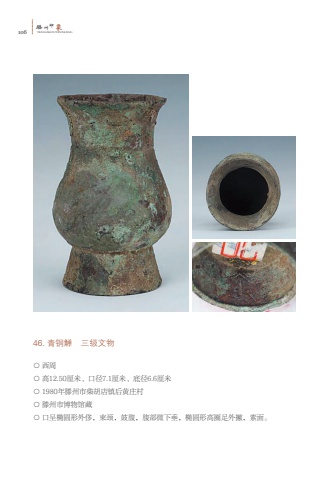 106%u6ed5TENGZHOUYINXIANG%u5dde%u5370%u8c6146. %u9752%u94dc%u89ef %u4e09%u7ea7%u6587%u7269%u25cb %u897f%u5468%u25cb %u9ad812.50%u5398%u7c73%u3001%u53e3%u5f847.1%u5398%u7c73%u3001%u5e95%u5f846.6%u5398%u7c73%u25cb 1980%u5e74%u6ed5%u5dde%u5e02%u67f4%u80e1%u5e97%u9547%u540e%u9ec4%u5e84%u6751%u25cb %u6ed5%u5dde%u5e02%u535a%u7269%u9986%u85cf%u25cb %u53e3%u5448%u692d%u5706%u5f62%u5916%u4f88%uff0c%u675f%u9888%uff0c%u9f13%u8179%uff0c%u8179%u90e8%u5fae%u4e0b%u5782%uff0c%u692d%u5706%u5f62%u9ad8%u5708%u8db3%u5916%u6487%uff0c%u7d20%u9762%u3002