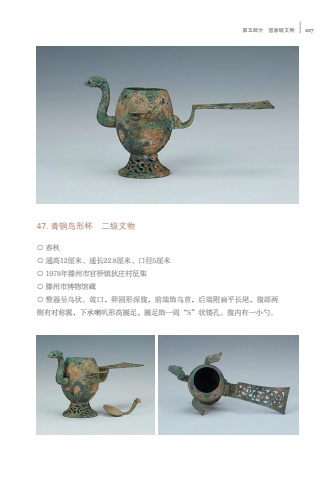 %u7b2c%u4e94%u90e8%u5206 %u56fd%u5bb6%u7ea7%u6587%u7269 10747. %u9752%u94dc%u9e1f%u5f62%u676f %u4e8c%u7ea7%u6587%u7269%u25cb %u6625%u79cb%u25cb %u901a%u9ad812%u5398%u7c73%u3001%u901a%u957f22.8%u5398%u7c73%u3001%u53e3%u5f845%u5398%u7c73%u25cb 1978%u5e74%u6ed5%u5dde%u5e02%u5b98%u6865%u9547%u72c4%u5e84%u6751%u5f81%u96c6%u25cb %u6ed5%u5dde%u5e02%u535a%u7269%u9986%u85cf%u25cb %u6574%u5668%u5448%u9e1f%u72b6%u3002%u655b%u53e3%uff0c%u5375%u5706%u5f62%u6df1%u8179%uff0c%u524d%u7aef%u9970%u9e1f%u9996%uff0c%u540e%u7aef%u9644%u6241%u5e73%u957f%u5c3e%uff0c%u8179%u90e8%u4e24%u4fa7%u6709%u5bf9%u79f0%u7ffc%uff0c%u4e0b%u627f%u5587%u53ed%u5f62%u9ad8%u5708%u8db3%uff0c%u5708%u8db3%u9970%u4e00%u5468%u201cS%u201d%u72b6%u9542%u5b54%u3002%u8179%u5185%u6709%u4e00%u5c0f%u52fa%u3002