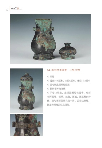 114%u6ed5TENGZHOUYINXIANG%u5dde%u5370%u8c6154. %u51e4%u9e1f%u7eb9%u9752%u94dc%u58f6 %u4e09%u7ea7%u6587%u7269%u25cb %u897f%u5468%u25cb %u901a%u9ad824.6%u5398%u7c73%u3001%u53e3%u5f848%u5398%u7c73%u3001%u5e95%u5f8410.2%u5398%u7c73%u25cb %u59dc%u5c6f%u9547%u5e84%u91cc%u897f%u6751%u5f81%u96c6%u25cb %u6ed5%u5dde%u5e02%u535a%u7269%u9986%u85cf%u25cb %u5b50%u6bcd%u53e3%u5e26%u76d6%uff0c%u76d6%u9876%u7f6e%u5708%u8db3%u72b6%u6349%u624b%uff0c%u80a9%u90e8%u6709%u4e24%u8d2f%u8033%uff0c%u957f%u9888%uff0c%u9f13%u8179%uff0c%u5708%u5e95%uff0c%u5708%u8db3%u7a0d%u5411%u5916%u4f88%u3002%u76d6%u4e0e%u9888%u90e8%u5404%u9970%u9e1f%u7eb9%u4e00%u5468%uff0c%u4e91%u96f7%u7eb9%u586b%u5730%uff0c%u5708%u8db3%u9970%u659c%u89d2%u4e91%u7eb9%u53ca%u8d1d%u7eb9%u3002