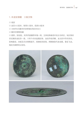 %u7b2c%u4e94%u90e8%u5206 %u56fd%u5bb6%u7ea7%u6587%u7269 1471. %u56db%u9f99%u7eb9%u94dc%u955c %u4e09%u7ea7%u6587%u7269%u25cb %u6218%u56fd%u25cb %u76f4%u5f8414.5%u5398%u7c73%u3001%u7f18%u539a0.1%u5398%u7c73%u3001%u7ebd%u9ad80.8%u5398%u7c73%u25cb 1999%u5e748%u6708%u6ed5%u5dde%u5e02%u5b98%u6865%u9547%u4e1c%u90d1%u5e84%u6751%u51fa%u571f%u25cb %u6ed5%u5dde%u5e02%u535a%u7269%u9986%u85cf%u25cb %u5706%u5f62%uff0c%u5f26%u7eb9%u94ae%u3002%u5176%u5916%u51f9%u9762%u5708%u5e26%u73af%u7ed5%u4e00%u5468%uff0c%u4e3b%u4f53%u7eb9%u9970%u88ab%u82b1%u53f6%u7eb9%u5206%u4e3a%u56db%u533a%uff0c%u6bcf%u533a%u9970%u56de%u9996%u53cd%u987e%u7684%u9f99%u7eb9%u5404%u4e00%u6761%uff0c%u5341%u56db%u4e2a%u5185%u5411%u8fde%u5f27%u7eb9%u7f18%u3002%u9f99%u7eb9%u4f5c%u6d45%u6d6e%u96d5%uff0c%u9f99%u5934%u5c45%u4e2d%u4f5c%u56de%u9996%u72b6%uff0c%u5f20%u543b%u9732%u9f7f%uff0c%u8eab%u8eaf%u53ca%u722a%u5411%u4e24%u4fa7%u5c55%u5f00%uff0c%u5c3e%u7ec6%u77ed%u800c%u524d%u5377%uff0c%u4e24%u4fa7%u7ec6%u6761%u4ee3%u8868%u9f99%u7ffc%uff0c%u8c61%u5f81%u98de%u9f99%uff0c%u5730%u7eb9%u4e3a%u7ec6%u5bc6%u7684%u4e91%u96f7%u7eb9%u3002