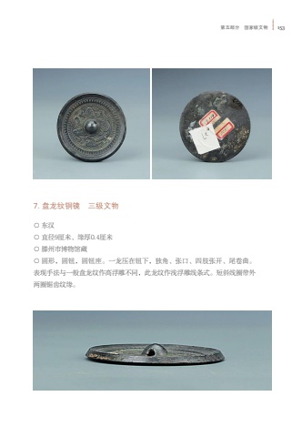 %u7b2c%u4e94%u90e8%u5206 %u56fd%u5bb6%u7ea7%u6587%u7269 1537. %u76d8%u9f99%u7eb9%u94dc%u955c %u4e09%u7ea7%u6587%u7269%u25cb %u4e1c%u6c49%u25cb %u76f4%u5f849%u5398%u7c73%u3001%u7f18%u539a0.4%u5398%u7c73%u25cb %u6ed5%u5dde%u5e02%u535a%u7269%u9986%u85cf%u25cb %u5706%u5f62%uff0c%u5706%u94ae%uff0c%u5706%u94ae%u5ea7%u3002%u4e00%u9f99%u538b%u5728%u94ae%u4e0b%uff0c%u72ec%u89d2%u3001%u5f20%u53e3%u3001%u56db%u80a2%u5f20%u5f00%u3001%u5c3e%u5377%u66f2%u3002%u8868%u73b0%u624b%u6cd5%u4e0e%u4e00%u822c%u76d8%u9f99%u7eb9%u4f5c%u9ad8%u6d6e%u96d5%u4e0d%u540c%uff0c%u6b64%u9f99%u7eb9%u4f5c%u6d45%u6d6e%u96d5%u7ebf%u6761%u5f0f%u3002%u77ed%u659c%u7ebf%u5708%u5e26%u5916%u4e24%u5708%u952f%u9f7f%u7eb9%u7f18%u3002