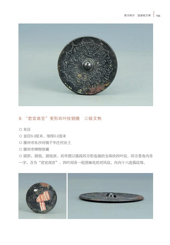 %u7b2c%u4e94%u90e8%u5206 %u56fd%u5bb6%u7ea7%u6587%u7269 1559. %u201c%u541b%u5b9c%u9ad8%u5b98%u201d%u53d8%u5f62%u56db%u53f6%u7eb9%u94dc%u955c %u4e09%u7ea7%u6587%u7269%u25cb %u4e1c%u6c49%u25cb %u76f4%u5f849.3%u5398%u7c73%u3001%u7f18%u539a0.2%u5398%u7c73%u25cb %u6ed5%u5dde%u5e02%u4e1c%u6c99%u6cb3%u9547%u5343%u5e74%u5e84%u6751%u51fa%u571f%u25cb %u6ed5%u5dde%u5e02%u535a%u7269%u9986%u85cf%u25cb %u5706%u5f62%uff0c%u5706%u94ae%uff0c%u5706%u94ae%u5ea7%u3002%u5176%u5916%u56f4%u4ee5%u5f27%u7ebf%u56db%u65b9%u5f62%u8fde%u63a5%u7684%u5b9d%u73e0%u72b6%u56db%u53f6%u7eb9%u3002%u56db%u65b9%u59d4%u89d2%u5185%u5404%u4e00%u5b57%uff0c%u5408%u4e3a%u201c%u541b%u5b9c%u9ad8%u5b98%u201d%u3002%u56db%u53f6%u95f4%u5404%u4e00%u7ec4%u56fe%u6848%u5316%u7684%u5bf9%u51e4%u7eb9%uff0c%u5185%u5411%u5341%u516d%u8fde%u5f27%u7eb9%u7f18%u3002