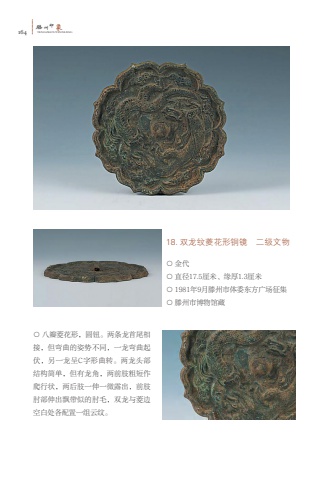 164%u6ed5TENGZHOUYINXIANG%u5dde%u5370%u8c6118. %u53cc%u9f99%u7eb9%u83f1%u82b1%u5f62%u94dc%u955c %u4e8c%u7ea7%u6587%u7269%u25cb %u91d1%u4ee3%u25cb %u76f4%u5f8417.5%u5398%u7c73%u3001%u7f18%u539a1.3%u5398%u7c73%u25cb 1981%u5e749%u6708%u6ed5%u5dde%u5e02%u4f53%u59d4%u4e1c%u65b9%u5e7f%u573a%u5f81%u96c6%u25cb %u6ed5%u5dde%u5e02%u535a%u7269%u9986%u85cf%u25cb %u516b%u74e3%u83f1%u82b1%u5f62%uff0c%u5706%u94ae%u3002%u4e24%u6761%u9f99%u9996%u5c3e%u76f8%u63a5%uff0c%u4f46%u5f2f%u66f2%u7684%u59ff%u52bf%u4e0d%u540c%uff0c%u4e00%u9f99%u5f2f%u66f2%u8d77%u4f0f%uff0c%u53e6%u4e00%u9f99%u5448C%u5b57%u5f62%u66f2%u8f6c%u3002%u4e24%u9f99%u5934%u90e8%u7ed3%u6784%u7b80%u5355%uff0c%u4f46%u6709%u9f99%u89d2%uff0c%u4e24%u524d%u80a2%u7c97%u77ed%u4f5c%u722c%u884c%u72b6%uff0c%u4e24%u540e%u80a2%u4e00%u4f38%u4e00%u5fae%u9732%u51fa%uff0c%u524d%u80a2%u8098%u90e8%u4f38%u51fa%u98d8%u5e26%u4f3c%u7684%u8098%u6bdb%uff0c%u53cc%u9f99%u4e0e%u83f1%u8fb9%u7a7a%u767d%u5904%u5404%u914d%u7f6e%u4e00%u7ec4%u4e91%u7eb9%u3002