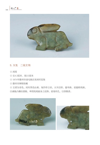 172%u6ed5TENGZHOUYINXIANG%u5dde%u5370%u8c615. %u7389%u5154 %u4e8c%u7ea7%u6587%u7269%u25cb %u897f%u5468%u25cb %u957f4.3%u5398%u7c73%u3001%u5bbd2.5%u5398%u7c73%u25cb 1974%u5e74%u6ed5%u5dde%u5e02%u59dc%u5c6f%u9547%u5e84%u91cc%u897f%u6751%u5f81%u96c6%u25cb %u6ed5%u5dde%u5e02%u535a%u7269%u9986%u85cf%u25cb %u7389%u8d28%u4e3a%u9752%u8272%uff0c%u95f4%u6709%u9ed1%u8272%u6c81%u6591%u3002%u5154%u4f5c%u505c%u7acb%u72b6%uff0c%u5927%u8033%u540e%u4ef0%uff0c%u817f%u5f2f%u66f2%uff0c%u524d%u817f%u7a0d%u6b8b%u7f3a%uff0c%u4ee5%u51cf%u5730%u51f8%u96d5%u51fa%u5706%u773c%uff0c%u5355%u9634%u7ebf%u523b%u753b%u8eab%u4e0a%u7eb9%u9970%uff0c%u524d%u7aef%u6709%u5b54%uff0c%u4ee5%u4f9b%u4f69%u7cfb%u3002