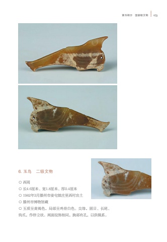 %u7b2c%u4e94%u90e8%u5206 %u56fd%u5bb6%u7ea7%u6587%u7269 1736. %u7389%u9e1f %u4e8c%u7ea7%u6587%u7269%u25cb %u897f%u5468%u25cb %u957f4.6%u5398%u7c73%u3001%u5bbd1.8%u5398%u7c73%u3001%u539a0.4%u5398%u7c73%u25cb 1982%u5e743%u6708%u6ed5%u5dde%u5e02%u59dc%u5c6f%u9547%u5e84%u91cc%u897f%u6751%u51fa%u571f%u25cb %u6ed5%u5dde%u5e02%u535a%u7269%u9986%u85cf%u25cb %u7389%u8d28%u5448%u9ec4%u8910%u8272%uff0c%u5c40%u90e8%u5448%u9e21%u9aa8%u767d%u8272%u3002%u5c16%u7f18%uff0c%u5706%u76ee%u3001%u957f%u5c3e%u3001%u94a9%u722a%uff0c%u4f5c%u505c%u7acb%u72b6%u3002%u4e24%u9762%u7eb9%u9970%u76f8%u540c%uff0c%u80f8%u90e8%u6709%u5b54%uff0c%u4ee5%u4f9b%u4f69%u7cfb%u3002