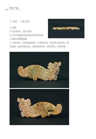 174%u6ed5TENGZHOUYINXIANG%u5dde%u5370%u8c617. %u7389%u864e %u4e8c%u7ea7%u6587%u7269%u25cb %u897f%u5468%u25cb %u957f10%u5398%u7c73%u3001%u5bbd3.3%u5398%u7c73%u25cb 1978%u5e74%u6ed5%u5dde%u5e02%u59dc%u5c6f%u9547%u5e84%u91cc%u897f%u6751%u5f81%u96c6%u25cb %u6ed5%u5dde%u5e02%u535a%u7269%u9986%u85cf%u25cb %u7389%u8d28%u9752%u8272%uff0c%u5c40%u90e8%u4fb5%u8680%u8f83%u91cd%uff0c%u5448%u9e21%u9aa8%u767d%u8272%u3002%u864e%u4f5c%u505c%u7acb%u72b6%u56de%u9996%uff0c%u62f1%u80cc%u5377%u5c3e%uff0c%u864e%u8eab%u4f5c%u5377%u4e91%u7eb9%uff0c%u4e24%u8fb9%u7eb9%u9970%u76f8%u540c%u3002%u864e%u80cc%u6709%u5b54%uff0c%u4ee5%u4f9b%u7a7f%u7cfb%u3002