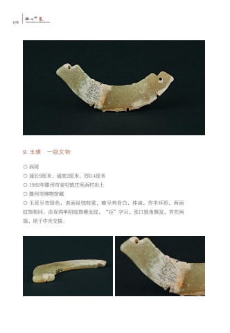 176%u6ed5TENGZHOUYINXIANG%u5dde%u5370%u8c619. %u7389%u749c %u4e00%u7ea7%u6587%u7269%u25cb %u897f%u5468%u25cb %u901a%u957f9%u5398%u7c73%u3001%u901a%u5bbd2%u5398%u7c73%u3001%u539a0.4%u5398%u7c73%u25cb 1982%u5e74%u6ed5%u5dde%u5e02%u59dc%u5c6f%u9547%u5e84%u91cc%u897f%u6751%u51fa%u571f%u25cb %u6ed5%u5dde%u5e02%u535a%u7269%u9986%u85cf%u25cb %u7389%u8d28%u5448%u9752%u7eff%u8272%uff0c%u8868%u9762%u6d78%u8680%u8f83%u91cd%uff0c%u7565%u5448%u9e21%u9aa8%u767d%uff0c%u4f53%u6241%uff0c%u4f5c%u534a%u73af%u5f62%uff0c%u4e24%u9762%u7eb9%u9970%u76f8%u540c%u3002%u7531%u53cc%u94a9%u5355%u9634%u7ebf%u9970%u5914%u9f99%u7eb9%uff0c%u201c%u81e3%u201d%u5b57%u76ee%uff0c%u5f20%u53e3%u72ec%u89d2%u98d8%u53d1%uff0c%u9996%u5728%u4e24%u7aef%uff0c%u5c3e%u4e8e%u4e2d%u592e%u4ea4%u63a5%u3002
