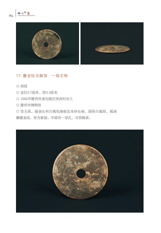 184%u6ed5TENGZHOUYINXIANG%u5dde%u5370%u8c6117. %u5914%u9f99%u7eb9%u7389%u4f69%u9970 %u4e00%u7ea7%u6587%u7269%u25cb %u897f%u5468%u25cb %u76f4%u5f843.7%u5398%u7c73%u3001%u539a0.4%u5398%u7c73%u25cb 1982%u5e74%u6ed5%u5dde%u5e02%u59dc%u5c6f%u9547%u5e84%u91cc%u897f%u6751%u51fa%u571f%u25cb %u6ed5%u5dde%u5e02%u535a%u7269%u9986%u25cb %u9752%u7389%u8d28%uff0c%u5668%u8868%u6c81%u6709%u767d%u8910%u8272%u6591%u75d5%u53ca%u6731%u7802%u6c81%u75d5%u3002%u5706%u5f62%u51f8%u5f27%u5f62%uff0c%u5f27%u9762%u96d5%u5914%u9f99%u7eb9%uff0c%u80cc%u4e3a%u7d20%u9762%uff0c%u4e2d%u90e8%u6709%u4e00%u7a7f%u5b54%uff0c%u53ef%u4f9b%u4f69%u7cfb%u3002