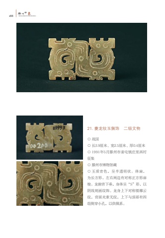 188%u6ed5TENGZHOUYINXIANG%u5dde%u5370%u8c6121. %u5914%u9f99%u7eb9%u7389%u4f69%u9970 %u4e8c%u7ea7%u6587%u7269%u25cb %u6218%u56fd%u25cb %u957f3.9%u5398%u7c73%u3001%u5bbd2.5%u5398%u7c73%u3001%u539a0.4%u5398%u7c73%u25cb 1991%u5e745%u6708%u6ed5%u5dde%u5e02%u59dc%u5c6f%u9547%u5e84%u91cc%u897f%u6751%u5f81%u96c6%u25cb %u6ed5%u5dde%u5e02%u535a%u7269%u9986%u85cf%u25cb %u7389%u8d28%u9752%u8272%uff0c%u5448%u534a%u900f%u660e%u72b6%u3002%u4f53%u6241%uff0c%u4e3a%u957f%u65b9%u5f62%uff0c%u5de6%u53f3%u4e24%u8fb9%u6709%u5bf9%u79f0%u6b63%u65b9%u5f62%u6249%u68f1%u3002%u9f99%u4fef%u9996%u4e0b%u5782%uff0c%u8eab%u4f53%u5448%u201cS%u201d%u5f62%uff0c%u4ee5%u9634%u7ebf%u523b%u753b%u7eb9%u9970%u3002%u9f99%u8eab%u4e0a%u4e0b%u5bf9%u79f0%u9542%u96d5%u4e91%u7eb9%uff0c%u80cc%u9762%u5149%u7d20%u65e0%u7eb9%uff0c%u4e0a%u4e0b%u4e0e%u9876%u90e8%u6709%u56db%u7ec4%u4fa7%u7a7f%u5c0f%u5b54%uff0c%u4ee5%u4f9b%u4f69%u7cfb%u3002