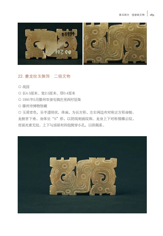 %u7b2c%u4e94%u90e8%u5206 %u56fd%u5bb6%u7ea7%u6587%u7269 18922. %u5914%u9f99%u7eb9%u7389%u4f69%u9970 %u4e8c%u7ea7%u6587%u7269%u25cb %u6218%u56fd%u25cb %u957f4.5%u5398%u7c73%u3001%u5bbd2.5%u5398%u7c73%u3001%u539a0.4%u5398%u7c73%u25cb 1991%u5e745%u6708%u6ed5%u5dde%u5e02%u59dc%u5c6f%u9547%u5e84%u91cc%u897f%u6751%u5f81%u96c6%u25cb %u6ed5%u5dde%u5e02%u535a%u7269%u9986%u85cf%u25cb %u7389%u8d28%u9752%u8272%uff0c%u5448%u534a%u900f%u660e%u72b6%uff0c%u4f53%u6241%uff0c%u4e3a%u957f%u65b9%u5f62%uff0c%u5de6%u53f3%u4e24%u8fb9%u6709%u5bf9%u79f0%u6b63%u65b9%u5f62%u6249%u68f1%u3002%u9f99%u4fef%u9996%u4e0b%u5782%uff0c%u8eab%u4f53%u5448%u201cS%u201d%u5f62%uff0c%u4ee5%u9634%u7ebf%u523b%u753b%u7eb9%u9970%u3002%u9f99%u8eab%u4e0a%u4e0b%u5bf9%u79f0%u9542%u96d5%u4e91%u7eb9%uff0c%u80cc%u9762%u5149%u7d20%u65e0%u7eb9%uff0c%u4e0a%u4e0b%u4e0e%u9876%u90e8%u6709%u56db%u7ec4%u4fa7%u7a7f%u5c0f%u5b54%uff0c%u4ee5%u4f9b%u4f69%u7cfb%u3002