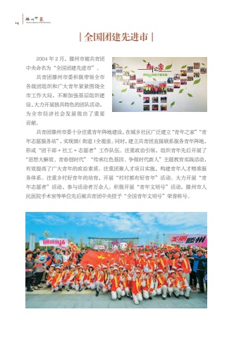 14%u6ed5TENGZHOUYINXIANG%u5dde%u5370%u8c61%u5168%u56fd%u56e2%u5efa%u5148%u8fdb%u5e022004 %u5e74 2 %u6708%uff0c%u6ed5%u5dde%u5e02%u88ab%u5171%u9752%u56e2%u4e2d%u592e%u547d%u540d%u4e3a%u201c%u5168%u56fd%u56e2%u5efa%u5148%u8fdb%u5e02%u201d%u3002%u5171%u9752%u56e2%u6ed5%u5dde%u5e02%u59d4%u79ef%u6781%u5e26%u9886%u5168%u5e02%u5404%u7ea7%u56e2%u7ec4%u7ec7%u548c%u5e7f%u5927%u9752%u5e74%u7d27%u7d27%u56f4%u7ed5%u5168%u5e02%u5de5%u4f5c%u5927%u5c40%uff0c%u4e0d%u65ad%u52a0%u5f3a%u57fa%u5c42%u7ec4%u7ec7%u5efa%u8bbe%uff0c%u5927%u529b%u5f00%u5c55%u72ec%u5177%u7279%u8272%u7684%u56e2%u961f%u6d3b%u52a8%uff0c%u4e3a%u5168%u5e02%u7ecf%u6d4e%u793e%u4f1a%u53d1%u5c55%u505a%u51fa%u4e86%u91cd%u8981%u8d21%u732e%u3002%u5171%u9752%u56e2%u6ed5%u5dde%u5e02%u59d4%u5341%u5206%u6ce8%u91cd%u9752%u5e74%u9635%u5730%u5efa%u8bbe%uff0c%u5728%u57ce%u4e61%u793e%u533a%u5e7f%u6cdb%u5efa%u7acb%u201c%u9752%u5e74%u4e4b%u5bb6%u201d%u201c%u9752%u5e74%u5fd7%u613f%u670d%u52a1%u7ad9%u201d%uff0c%u5b9e%u73b0%u9547%uff08%u8857%u9053%uff09%u5168%u8986%u76d6%u3002%u540c%u65f6%uff0c%u5efa%u7acb%u5171%u9752%u56e2%u76f4%u63a5%u8054%u7cfb%u670d%u52a1%u9752%u5e74%u9635%u5730%uff0c%u5f62%u6210%u201c%u56e2%u5e72%u90e8 + %u793e%u5de5 + %u5fd7%u613f%u8005%u201d%u5de5%u4f5c%u961f%u4f0d%u3002%u6ce8%u91cd%u653f%u6cbb%u5f15%u9886%uff0c%u7ec4%u7ec7%u9752%u5e74%u5148%u540e%u5f00%u5c55%u4e86%u201c%u601d%u60f3%u5927%u89e3%u653e%u3001%u9752%u6625%u521b%u65f6%u4ee3%u201d%u201c%u4f20%u627f%u7ea2%u8272%u57fa%u56e0%u3001%u4e89%u505a%u65f6%u4ee3%u65b0%u4eba%u201d%u4e3b%u9898%u6559%u80b2%u5b9e%u8df5%u6d3b%u52a8%uff0c%u6709%u6548%u63d0%u9ad8%u4e86%u5e7f%u5927%u9752%u5e74%u7684%u653f%u6cbb%u7d20%u8d28%u3002%u6ce8%u91cd%u56e2%u805a%u4eba%u624d%u9879%u76ee%u5b9e%u65bd%uff0c%u6784%u5efa%u9752%u5e74%u4eba%u624d%u7cbe%u51c6%u670d%u52a1%u4f53%u7cfb%u3002%u6ce8%u91cd%u4e61%u6751%u597d%u9752%u5e74%u7684%u57f9%u80b2%uff0c%u5f00%u5c55%u201c%u6751%u6751%u90fd%u6709%u597d%u9752%u5e74%u201d%u6d3b%u52a8%u3002%u5927%u529b%u5f00%u5c55%u201c%u9752%u5e74%u5fd7%u613f%u8005%u201d%u6d3b%u52a8%uff0c%u53c2%u4e0e%u6d3b%u52a8%u8005%u4e07%u4f59%u4eba%u3002%u79ef%u6781%u5f00%u5c55%u201c%u9752%u5e74%u6587%u660e%u53f7%u201d%u6d3b%u52a8%uff0c%u6ed5%u5dde%u5e02%u4eba%u6c11%u533b%u9662%u624b%u672f%u5ba4%u7b49%u5355%u4f4d%u5148%u540e%u88ab%u5171%u9752%u56e2%u4e2d%u592e%u6388%u4e88%u201c%u5168%u56fd%u9752%u5e74%u6587%u660e%u53f7%u201d%u8363%u8a89%u79f0%u53f7%u3002