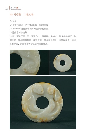 196%u6ed5TENGZHOUYINXIANG%u5dde%u5370%u8c6129. %u739b%u7459%u58c1 %u4e8c%u7ea7%u6587%u7269%u25cb %u5143%u4ee3%u25cb %u76f4%u5f847.5%u5398%u7c73%u3001%u5185%u5f842.3%u5398%u7c73%u3001%u539a0.9%u5398%u7c73%u25cb 1982%u5e7412%u6708%u6ed5%u5dde%u5e02%u8346%u6cb3%u8857%u9053%u97e9%u6865%u6751%u51fa%u571f%u25cb %u6ed5%u5dde%u5e02%u535a%u7269%u9986%u85cf%u25cb %u74a7%u4e00%u9762%u4e3a%u5e73%u9762%uff0c%u53e6%u4e00%u9762%u5fae%u51f8%uff0c%u4e0a%u9762%u6d6e%u96d5%u4e00%u6761%u87ad%u9f99%uff0c%u87ad%u9f99%u8eaf%u4f53%u7ec6%u957f%uff0c%u4f5c%u722c%u884c%u72b6%uff0c%u87ad%u8eab%u968f%u74a7%u5f2f%u66f2%uff0c%u7ffb%u8f6c%u81ea%u5982%uff0c%u87ad%u9f99%u8eaf%u5e72%u7ec6%u957f%uff0c%u52a8%u52bf%u8d77%u4f0f%u5927%uff0c%u751f%u52a8%u5bcc%u6709%u795e%u91c7%uff0c%u4e3a%u5143%u4ee3%u6781%u4e3a%u5c11%u89c1%u7684%u739b%u7459%u88c5%u9970%u54c1%u3002