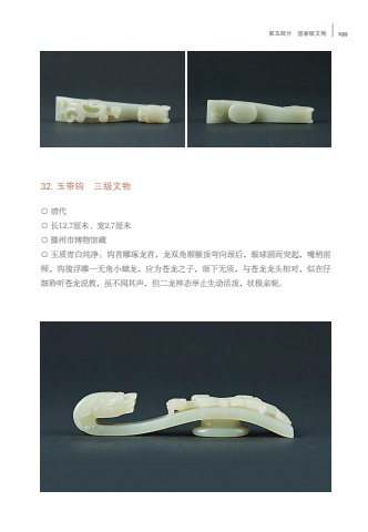 %u7b2c%u4e94%u90e8%u5206 %u56fd%u5bb6%u7ea7%u6587%u7269 19932. %u7389%u5e26%u94a9 %u4e09%u7ea7%u6587%u7269%u25cb %u6e05%u4ee3%u25cb %u957f12.7%u5398%u7c73%u3001%u5bbd2.7%u5398%u7c73%u25cb %u6ed5%u5dde%u5e02%u535a%u7269%u9986%u85cf%u25cb %u7389%u8d28%u9752%u767d%u7eaf%u51c0%u3002%u94a9%u9996%u96d5%u7422%u9f99%u9996%uff0c%u9f99%u53cc%u89d2%u987a%u989d%u9876%u5f2f%u5411%u9888%u540e%uff0c%u773c%u7403%u5706%u800c%u7a81%u8d77%uff0c%u5634%u7a0d%u524d%u503e%uff0c%u94a9%u8179%u6d6e%u96d5%u4e00%u65e0%u89d2%u5c0f%u87ad%u9f99%uff0c%u5e94%u4e3a%u82cd%u9f99%u4e4b%u5b50%uff0c%u988c%u4e0b%u65e0%u987b%uff0c%u4e0e%u82cd%u9f99%u9f99%u5934%u76f8%u5bf9%uff0c%u4f3c%u5728%u4ed4%u7ec6%u8046%u542c%u82cd%u9f99%u8bf4%u6559%uff0c%u867d%u4e0d%u95fb%u5176%u58f0%uff0c%u4f46%u4e8c%u9f99%u795e%u6001%u4e3e%u6b62%u751f%u52a8%u6d3b%u6cfc%uff0c%u72b6%u6781%u4eb2%u6635%u3002