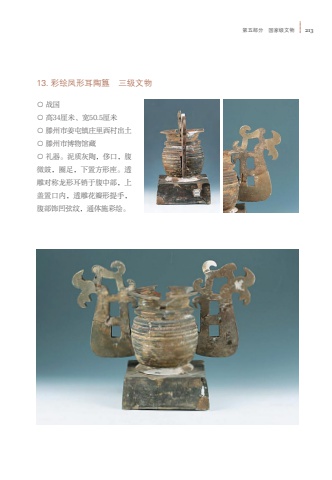 %u7b2c%u4e94%u90e8%u5206 %u56fd%u5bb6%u7ea7%u6587%u7269 21313. %u5f69%u7ed8%u51e4%u5f62%u8033%u9676%u7c0b %u4e09%u7ea7%u6587%u7269%u25cb %u6218%u56fd%u25cb %u9ad834%u5398%u7c73%u3001%u5bbd50.5%u5398%u7c73%u25cb %u6ed5%u5dde%u5e02%u59dc%u5c6f%u9547%u5e84%u91cc%u897f%u6751%u51fa%u571f%u25cb %u6ed5%u5dde%u5e02%u535a%u7269%u9986%u85cf%u25cb %u793c%u5668%u3002%u6ce5%u8d28%u7070%u9676%uff0c%u4f88%u53e3%uff0c%u8179%u5fae%u9f13%uff0c%u5708%u8db3%uff0c%u4e0b%u7f6e%u65b9%u5f62%u5ea7%u3002%u900f%u96d5%u5bf9%u79f0%u9f99%u5f62%u8033%u9500%u4e8e%u8179%u4e2d%u90e8%uff0c%u4e0a%u76d6%u7f6e%u53e3%u5185%uff0c%u900f%u96d5%u82b1%u74e3%u5f62%u63d0%u624b%uff0c%u8179%u90e8%u9970%u51f9%u5f26%u7eb9%uff0c%u901a%u4f53%u65bd%u5f69%u7ed8%u3002