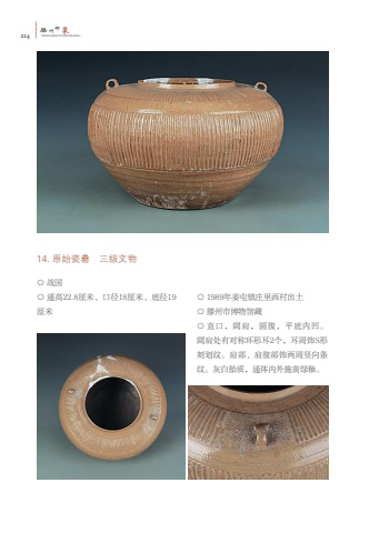 214%u6ed5TENGZHOUYINXIANG%u5dde%u5370%u8c6114. %u539f%u59cb%u74f7%u7f4d %u4e09%u7ea7%u6587%u7269%u25cb %u6218%u56fd%u25cb %u901a%u9ad822.8%u5398%u7c73%u3001%u53e3%u5f8418%u5398%u7c73%u3001%u5e95%u5f8419%u5398%u7c73%u25cb 1989%u5e74%u59dc%u5c6f%u9547%u5e84%u91cc%u897f%u6751%u51fa%u571f%u25cb %u6ed5%u5dde%u5e02%u535a%u7269%u9986%u85cf%u25cb %u76f4%u53e3%uff0c%u9614%u80a9%uff0c%u5706%u8179%uff0c%u5e73%u5e95%u5185%u51f9%u3002%u9614%u80a9%u5904%u6709%u5bf9%u79f0%u73af%u5f62%u80332%u4e2a%uff0c%u8033%u5468%u9970S%u5f62%u523b%u5212%u7eb9%u3002%u80a9%u90e8%u3001%u80a9%u8179%u90e8%u9970%u4e24%u5468%u7ad6%u5411%u6761%u7eb9%u3002%u7070%u767d%u80ce%u8d28%uff0c%u901a%u4f53%u5185%u5916%u65bd%u9ec4%u7eff%u91c9%u3002