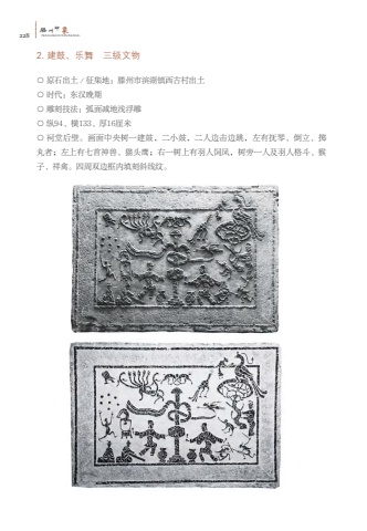228%u6ed5TENGZHOUYINXIANG%u5dde%u5370%u8c612. %u5efa%u9f13%u3001%u4e50%u821e %u4e09%u7ea7%u6587%u7269%u25cb %u539f%u77f3%u51fa%u571f%uff0f%u5f81%u96c6%u5730%uff1a%u6ed5%u5dde%u5e02%u6ee8%u6e56%u9547%u897f%u53e4%u6751%u51fa%u571f%u25cb %u65f6%u4ee3%uff1a%u4e1c%u6c49%u665a%u671f%u25cb %u96d5%u523b%u6280%u6cd5%uff1a%u5f27%u9762%u51cf%u5730%u6d45%u6d6e%u96d5%u25cb %u7eb594%u3001%u6a2a133%u3001%u539a16%u5398%u7c73%u25cb %u7960%u5802%u540e%u58c1%u3002%u753b%u9762%u4e2d%u592e%u6811%u4e00%u5efa%u9f13%uff0c%u4e8c%u5c0f%u9f13%uff0c%u4e8c%u4eba%u8fb9%u51fb%u8fb9%u8df3%uff0c%u5de6%u6709%u629a%u7434%u3001%u5012%u7acb%u3001%u63b7%u4e38%u8005%uff1b%u5de6%u4e0a%u6709%u4e03%u9996%u795e%u517d%u3001%u732b%u5934%u9e70%uff1b%u53f3%u4e00%u6811%u4e0a%u6709%u7fbd%u4eba%u9972%u51e4%uff0c%u6811%u65c1%u4e00%u4eba%u53ca%u7fbd%u4eba%u683c%u6597%u3001%u7334%u5b50%u3001%u7965%u79bd%u3002%u56db%u5468%u53cc%u8fb9%u6846%u5185%u586b%u523b%u659c%u7ebf%u7eb9%u3002