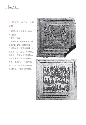 236%u6ed5TENGZHOUYINXIANG%u5dde%u5370%u8c6110. %u897f%u738b%u6bcd%u3001%u725b%u7f8a%u8f66 %u4e09%u7ea7%u6587%u7269%u25cb %u539f%u77f3%u51fa%u571f%uff0f%u5f81%u96c6%u5730%uff1a%u5c71%u4ead%u5927%u90ed%u6751%u51fa%u571f%u25cb %u65f6%u4ee3%uff1a%u4e1c%u6c49%u25cb %u96d5%u523b%u6280%u6cd5%uff1a%u5f27%u9762%u51cf%u5730%u6d45%u6d6e%u96d5%u25cb %u7eb574%u3001%u6a2a75%u3001%u539a15%u5398%u7c73%u25cb %u7960%u5802%u53f3%u58c1%u3002%u4e24%u9762%u6709%u753b%u50cf%u3002%u6b63%u9762%u753b%u9762%u4e8c%u5c42%uff1a%u4e0a%u5c42%uff0c%u4e2d%u95f4%u897f%u738b%u6bcd%u7aef%u5750%uff0c%u4f0f%u7fb2%u5973%u5a32%u624b%u6267%u4fbf%u9762%uff0c%u5de6%u6709%u4e5d%u5c3e%u72d0%uff0c%u53f3%u6709%u7389%u5154%u6363%u836f%u3001%u87fe%u870d%uff0c%u4e0b%u5750%u516d%u4eba%uff0c%u4e2d%u95f4%u653e%u7f6e%u4e8c%u58f6%uff1b%u4e0b%u5c42%uff0c%u725b%u8f66%u7f8a%u8f66%u5404%u4e00%u8f86%uff0c%u98de%u9e1f%u4f34%u884c%u3002%u4e00%u4fa7%u9762%u523b%u83f1%u5f62%u7eb9%u3002