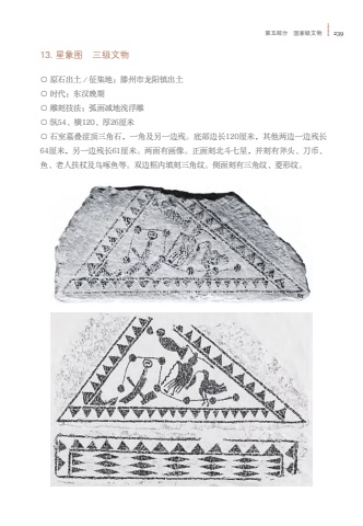 %u7b2c%u4e94%u90e8%u5206 %u56fd%u5bb6%u7ea7%u6587%u7269 23913. %u661f%u8c61%u56fe %u4e09%u7ea7%u6587%u7269%u25cb %u539f%u77f3%u51fa%u571f%uff0f%u5f81%u96c6%u5730%uff1a%u6ed5%u5dde%u5e02%u9f99%u9633%u9547%u51fa%u571f%u25cb %u65f6%u4ee3%uff1a%u4e1c%u6c49%u665a%u671f%u25cb %u96d5%u523b%u6280%u6cd5%uff1a%u5f27%u9762%u51cf%u5730%u6d45%u6d6e%u96d5%u25cb %u7eb554%u3001%u6a2a120%u3001%u539a26%u5398%u7c73%u25cb %u77f3%u5ba4%u5893%u53e0%u6da9%u9876%u4e09%u89d2%u77f3%uff0c%u4e00%u89d2%u53ca%u53e6%u4e00%u8fb9%u6b8b%u3002%u5e95%u90e8%u8fb9%u957f120%u5398%u7c73%uff0c%u5176%u4ed6%u4e24%u8fb9%u4e00%u8fb9%u6b8b%u957f64%u5398%u7c73%uff0c%u53e6%u4e00%u8fb9%u6b8b%u957f61%u5398%u7c73%u3002%u4e24%u9762%u6709%u753b%u50cf%u3002%u6b63%u9762%u523b%u5317%u6597%u4e03%u661f%uff0c%u5e76%u523b%u6709%u65a7%u5934%u3001%u5200%u5e01%u3001%u9c7c%u3001%u8001%u4eba%u6276%u6756%u53ca%u9e1f%u5544%u9c7c%u7b49%u3002%u53cc%u8fb9%u6846%u5185%u586b%u523b%u4e09%u89d2%u7eb9%u3002%u4fa7%u9762%u523b%u6709%u4e09%u89d2%u7eb9%u3001%u83f1%u5f62%u7eb9%u3002
