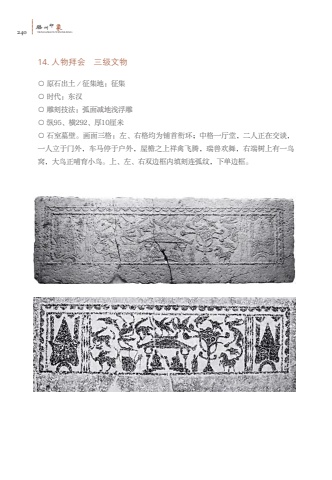 240%u6ed5TENGZHOUYINXIANG%u5dde%u5370%u8c6114. %u4eba%u7269%u62dc%u4f1a %u4e09%u7ea7%u6587%u7269%u25cb %u539f%u77f3%u51fa%u571f%uff0f%u5f81%u96c6%u5730%uff1a%u5f81%u96c6%u25cb %u65f6%u4ee3%uff1a%u4e1c%u6c49%u25cb %u96d5%u523b%u6280%u6cd5%uff1a%u5f27%u9762%u51cf%u5730%u6d45%u6d6e%u96d5%u25cb %u7eb595%u3001%u6a2a292%u3001%u539a10%u5398%u7c73%u25cb %u77f3%u5ba4%u5893%u58c1%u3002%u753b%u9762%u4e09%u683c%uff1a%u5de6%u3001%u53f3%u683c%u5747%u4e3a%u94fa%u9996%u8854%u73af%uff1b%u4e2d%u683c%u4e00%u5385%u5802%uff0c%u4e8c%u4eba%u6b63%u5728%u4ea4%u8c08%uff0c%u4e00%u4eba%u7acb%u4e8e%u95e8%u5916%uff0c%u8f66%u9a6c%u505c%u4e8e%u6237%u5916%uff0c%u5c4b%u6a90%u4e4b%u4e0a%u7965%u79bd%u98de%u817e%uff0c%u745e%u517d%u6b22%u821e%uff0c%u53f3%u7aef%u6811%u4e0a%u6709%u4e00%u9e1f%u7a9d%uff0c%u5927%u9e1f%u6b63%u54fa%u80b2%u5c0f%u9e1f%u3002%u4e0a%u3001%u5de6%u3001%u53f3%u53cc%u8fb9%u6846%u5185%u586b%u523b%u8fde%u5f27%u7eb9%uff0c%u4e0b%u5355%u8fb9%u6846%u3002