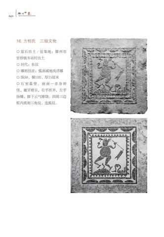 242%u6ed5TENGZHOUYINXIANG%u5dde%u5370%u8c6116. %u65b9%u76f8%u6c0f %u4e09%u7ea7%u6587%u7269%u25cb %u539f%u77f3%u51fa%u571f%uff0f%u5f81%u96c6%u5730%uff1a%u6ed5%u5dde%u5e02%u5b98%u6865%u9547%u8f66%u7ad9%u6751%u51fa%u571f%u25cb %u65f6%u4ee3%uff1a%u4e1c%u6c49%u25cb %u96d5%u523b%u6280%u6cd5%uff1a%u5f27%u9762%u51cf%u5730%u6d45%u6d6e%u96d5%u25cb %u7eb598%u3001%u6a2a100%u3001%u539a15%u5398%u7c73%u25cb %u77f3%u5ba4%u5893%u58c1%u3002%u753b%u9762%u4e00%u8d64%u8eab%u795e%u602a%uff0c%u9f87%u7259%u77aa%u76ee%uff0c%u53f3%u624b%u6325%u65a7%uff0c%u5de6%u624b%u626c%u5e61%uff0c%u811a%u4e0b%u4e91%u6c14%u7f2d%u7ed5%u3002%u56db%u5468%u4e09%u8fb9%u6846%u5185%u586b%u523b%u4e09%u89d2%u7eb9%u3001%u8fde%u5f27%u7eb9%u3002