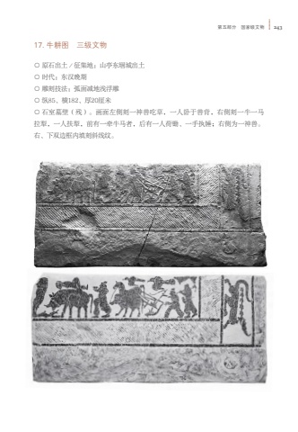 %u7b2c%u4e94%u90e8%u5206 %u56fd%u5bb6%u7ea7%u6587%u7269 24317. %u725b%u8015%u56fe %u4e09%u7ea7%u6587%u7269%u25cb %u539f%u77f3%u51fa%u571f%uff0f%u5f81%u96c6%u5730%uff1a%u5c71%u4ead%u4e1c%u580c%u57ce%u51fa%u571f%u25cb %u65f6%u4ee3%uff1a%u4e1c%u6c49%u665a%u671f%u25cb %u96d5%u523b%u6280%u6cd5%uff1a%u5f27%u9762%u51cf%u5730%u6d45%u6d6e%u96d5%u25cb %u7eb585%u3001%u6a2a182%u3001%u539a20%u5398%u7c73%u25cb %u77f3%u5ba4%u5893%u58c1%uff08%u6b8b%uff09%u3002%u753b%u9762%u5de6%u4fa7%u523b%u4e00%u795e%u517d%u5403%u8349%uff0c%u4e00%u4eba%u5367%u4e8e%u517d%u80cc%uff0c%u53f3%u4fa7%u523b%u4e00%u725b%u4e00%u9a6c%u62c9%u7281%uff0c%u4e00%u4eba%u6276%u7281%uff0c%u524d%u6709%u4e00%u7275%u725b%u9a6c%u8005%uff0c%u540e%u6709%u4e00%u4eba%u8377%u9504%u3001%u4e00%u624b%u6267%u9524%uff1b%u53f3%u4fa7%u4e3a%u4e00%u795e%u517d%u3002%u53f3%u3001%u4e0b%u53cc%u8fb9%u6846%u5185%u586b%u523b%u659c%u7ebf%u7eb9%u3002