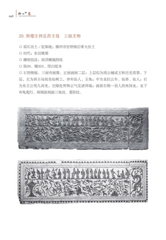 246%u6ed5TENGZHOUYINXIANG%u5dde%u5370%u8c6120. %u5468%u7a46%u738b%u62dc%u89c1%u897f%u738b%u6bcd %u4e09%u7ea7%u6587%u7269%u25cb %u539f%u77f3%u51fa%u571f%uff0f%u5f81%u96c6%u5730%uff1a%u6ed5%u5dde%u5e02%u5b98%u6865%u9547%u540e%u638c%u5927%u51fa%u571f%u25cb %u65f6%u4ee3%uff1a%u4e1c%u6c49%u665a%u671f%u25cb %u96d5%u523b%u6280%u6cd5%uff1a%u9ad8%u6d6e%u96d5%u65bd%u9634%u7ebf%u25cb %u7eb596%u3001%u6a2a305%u3001%u539a23%u5398%u7c73%u25cb %u77f3%u6901%u4fa7%u677f%u3002%u4e09%u9762%u6709%u753b%u50cf%u3002%u6b63%u9762%u753b%u9762%u4e8c%u5c42%uff1a%u4e0a%u5c42%u4f3c%u4e3a%u5468%u516c%u8f85%u6210%u738b%u548c%u5386%u53f2%u6545%u4e8b%u3002%u4e0b%u5c42%uff0c%u5de6%u4e3a%u897f%u738b%u6bcd%u9ad8%u5750%u4ed9%u6811%u4e0a%uff0c%u65c1%u6709%u4ed9%u4eba%u3001%u7389%u5154%uff1b%u4e2d%u4e3a%u9f99%u62c9%u4e91%u8f66%u3001%u4ed9%u517d%u3001%u4ed9%u4eba%uff1b%u53f3%u4e3a%u4e1c%u738b%u516c%u51ed%u51e0%u800c%u5750%uff0c%u7a7a%u9699%u5904%u7686%u9970%u4e91%u6c14%u53ca%u8bf8%u7965%u745e%uff1b%u753b%u9762%u53f3%u4fa7%u4e00%u7fbd%u4eba%u6301%u9c7c%u9972%u9f99%uff0c%u9f99%u4e0b%u6709%u9f9f%u722c%u884c%u3002%u4e24%u4fa7%u9762%u523b%u753b%u4e09%u89d2%u7eb9%u3001%u83f1%u5f62%u7eb9%u3002