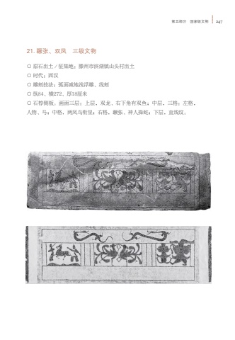 %u7b2c%u4e94%u90e8%u5206 %u56fd%u5bb6%u7ea7%u6587%u7269 24721. %u8e76%u5f20%u3001%u53cc%u51e4 %u4e09%u7ea7%u6587%u7269%u25cb %u539f%u77f3%u51fa%u571f%uff0f%u5f81%u96c6%u5730%uff1a%u6ed5%u5dde%u5e02%u6ee8%u6e56%u9547%u5c71%u5934%u6751%u51fa%u571f%u25cb %u65f6%u4ee3%uff1a%u897f%u6c49%u25cb %u96d5%u523b%u6280%u6cd5%uff1a%u5f27%u9762%u51cf%u5730%u6d45%u6d6e%u96d5%u3001%u7ebf%u523b%u25cb %u7eb584%u3001%u6a2a272%u3001%u539a18%u5398%u7c73%u25cb %u77f3%u6901%u4fa7%u677f%u3002%u753b%u9762%u4e09%u5c42%uff1a%u4e0a%u5c42%uff0c%u53cc%u9f99%u3001%u53f3%u4e0b%u89d2%u6709%u53cc%u9c7c%uff1b%u4e2d%u5c42%uff0c%u4e09%u683c%uff1a%u5de6%u683c%uff0c%u4eba%u7269%u3001%u9a6c%uff1b%u4e2d%u683c%uff0c%u4e24%u51e4%u9e1f%u8854%u661f%uff1b%u53f3%u683c%uff0c%u8e76%u5f20%u3001%u795e%u4eba%u64cd%u86c7%uff1b%u4e0b%u5c42%uff0c%u76f4%u7ebf%u7eb9%u3002