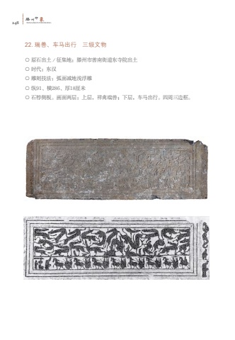 248%u6ed5TENGZHOUYINXIANG%u5dde%u5370%u8c6122. %u745e%u517d%u3001%u8f66%u9a6c%u51fa%u884c %u4e09%u7ea7%u6587%u7269%u25cb %u539f%u77f3%u51fa%u571f%uff0f%u5f81%u96c6%u5730%uff1a%u6ed5%u5dde%u5e02%u5584%u5357%u8857%u9053%u4e1c%u5bfa%u9662%u51fa%u571f%u25cb %u65f6%u4ee3%uff1a%u4e1c%u6c49%u25cb %u96d5%u523b%u6280%u6cd5%uff1a%u5f27%u9762%u51cf%u5730%u6d45%u6d6e%u96d5%u25cb %u7eb591%u3001%u6a2a286%u3001%u539a18%u5398%u7c73%u25cb %u77f3%u6901%u4fa7%u677f%u3002%u753b%u9762%u4e24%u5c42%uff1a%u4e0a%u5c42%uff0c%u7965%u79bd%u745e%u517d%uff1b%u4e0b%u5c42%uff0c%u8f66%u9a6c%u51fa%u884c%u3002%u56db%u5468%u4e09%u8fb9%u6846%u3002