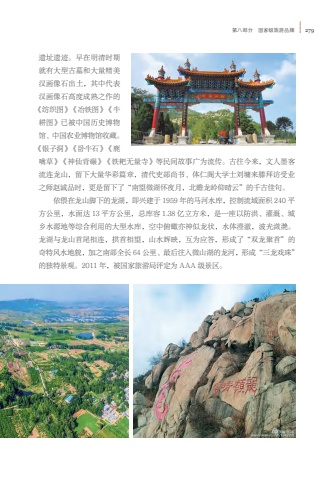 %u7b2c%u516b%u90e8%u5206 %u56fd%u5bb6%u7ea7%u65c5%u6e38%u54c1%u724c 279%u9057%u5740%u9057%u8ff9%u3002%u65e9%u5728%u660e%u6e05%u65f6%u671f%u5c31%u6709%u5927%u578b%u53e4%u5893%u548c%u5927%u91cf%u7cbe%u7f8e%u6c49%u753b%u50cf%u77f3%u51fa%u571f%uff0c%u5176%u4e2d%u4ee3%u8868%u6c49%u753b%u50cf%u77f3%u9ad8%u5ea6%u6210%u719f%u4e4b%u4f5c%u7684%u300a%u7eba%u7ec7%u56fe%u300b%u300a%u51b6%u94c1%u56fe%u300b%u300a%u725b%u8015%u56fe%u300b%u5df2%u88ab%u4e2d%u56fd%u5386%u53f2%u535a%u7269%u9986%u3001%u4e2d%u56fd%u519c%u4e1a%u535a%u7269%u9986%u6536%u85cf%u3002%u300a%u94f6%u5b50%u6d1e%u300b%u300a%u5367%u725b%u77f3%u300b%u300a%u9e7f%u5659%u8349%u300b%u300a%u795e%u4ed9%u80cc%u78be%u300b%u300a%u94c1%u8019%u65e0%u91cf%u5bfa%u300b%u7b49%u6c11%u95f4%u6545%u4e8b%u5e7f%u4e3a%u6d41%u4f20%u3002%u53e4%u5f80%u4eca%u6765%uff0c%u6587%u4eba%u58a8%u5ba2%u6d41%u8fde%u9f99%u5c71%uff0c%u7559%u4e0b%u5927%u91cf%u534e%u5f69%u7bc7%u7ae0%uff0c%u6e05%u4ee3%u540f%u90e8%u5c1a%u4e66%u3001%u4f53%u4ec1%u9601%u5927%u5b66%u58eb%u5218%u5889%u6765%u6ed5%u62dc%u8bbf%u53d7%u4e1a%u4e4b%u5e08%u8d75%u8bda%u54c1%u65f6%uff0c%u66f4%u662f%u7559%u4e0b%u4e86%u201c%u5357%u671b%u5fae%u6e56%u6000%u591c%u6708%uff0c%u5317%u77bb%u9f99%u5cad%u4ef0%u6674%u4e91%u201d%u7684%u5343%u53e4%u4f73%u53e5%u3002%u4f9d%u504e%u5728%u9f99%u5c71%u811a%u4e0b%u7684%u9f99%u6e56%uff0c%u5373%u5174%u5efa%u4e8e 1959 %u5e74%u7684%u9a6c%u6cb3%u6c34%u5e93%uff0c%u63a7%u5236%u6d41%u57df%u9762%u79ef 240 %u5e73%u65b9%u516c%u91cc%uff0c%u6c34%u9762%u8fbe 13 %u5e73%u65b9%u516c%u91cc%uff0c%u603b%u5e93%u5bb9 1.38 %u4ebf%u7acb%u65b9%u7c73%uff0c%u662f%u4e00%u5ea7%u4ee5%u9632%u6d2a%u3001%u704c%u6e89%u3001%u57ce%u4e61%u6c34%u6e90%u5730%u7b49%u7efc%u5408%u5229%u7528%u7684%u5927%u578b%u6c34%u5e93%uff0c%u7a7a%u4e2d%u4fef%u77b0%u4ea6%u795e%u4f3c%u9f99%u72b6%uff0c%u6c34%u4f53%u6f84%u6f88%uff0c%u6ce2%u5149%u6f4b%u6edf%u3002%u9f99%u6e56%u4e0e%u9f99%u5c71%u9996%u5c3e%u76f8%u8fde%uff0c%u62f1%u9996%u76f8%u671b%uff0c%u5c71%u6c34%u8f89%u6620%uff0c%u4e92%u4e3a%u5e94%u7b54%uff0c%u5f62%u6210%u4e86%u201c%u53cc%u9f99%u805a%u9996%u201d%u7684%u5947%u7279%u98ce%u6c34%u5730%u8c8c%uff0c%u52a0%u4e4b%u5357%u90e8%u5168%u957f 64 %u516c%u91cc%u3001%u6700%u540e%u6ce8%u5165%u5fae%u5c71%u6e56%u7684%u9f99%u6cb3%uff0c%u5f62%u6210%u201c%u4e09%u9f99%u620f%u73e0%u201d%u7684%u72ec%u7279%u666f%u89c2%u30022011 %u5e74%uff0c%u88ab%u56fd%u5bb6%u65c5%u6e38%u5c40%u8bc4%u5b9a%u4e3a AAA %u7ea7%u666f%u533a%u3002