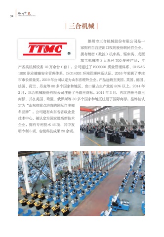 32%u6ed5TENGZHOUYINXIANG%u5dde%u5370%u8c61%u4e09%u5408%u673a%u68b0%u6ed5%u5dde%u5e02%u4e09%u5408%u673a%u68b0%u80a1%u4efd%u6709%u9650%u516c%u53f8%u662f%u4e00%u5bb6%u62e5%u6709%u81ea%u8425%u8fdb%u51fa%u53e3%u6743%u7684%u80a1%u4efd%u5236%u6c11%u8425%u4f01%u4e1a%u3002%u62e5%u6709%u7cbe%u5bc6%uff08%u6570%u63a7%uff09%u673a%u5e8a%u7c7b%u3001%u952f%u5e8a%u7c7b%u3001%u6210%u578b%u52a0%u5de5%u673a%u68b0%u7c7b 3 %u5927%u7cfb%u5217 700 %u591a%u79cd%u4ea7%u54c1%uff0c%u5e74%u4ea7%u5404%u7c7b%u673a%u68b0%u8bbe%u5907 10 %u4e07%u4f59%u53f0%uff08%u5957%uff09%u3002%u516c%u53f8%u901a%u8fc7%u4e86 ISO9001 %u8d28%u91cf%u7ba1%u7406%u4f53%u7cfb%u3001OHSAS 1800 %u804c%u4e1a%u5065%u5eb7%u5b89%u5168%u7ba1%u7406%u4f53%u7cfb%u3001ISO14001 %u73af%u5883%u7ba1%u7406%u4f53%u7cfb%u8ba4%u8bc1%uff0c2016 %u5e74%u8363%u83b7%u4e86%u67a3%u5e84%u5e02%u5e02%u957f%u8d28%u91cf%u5956%uff0c2019 %u5e74%u516c%u53f8%u8ba4%u5b9a%u4e3a%u5c71%u4e1c%u7701%u77aa%u7f9a%u4f01%u4e1a%u3002%u4ea7%u54c1%u8fdc%u9500%u81f3%u7f8e%u56fd%u3001%u82f1%u56fd%u3001%u5fb7%u56fd%u3001%u6cd5%u56fd%u3001%u8377%u5170%u3001%u4e39%u9ea6%u7b49 80 %u591a%u4e2a%u56fd%u5bb6%u548c%u5730%u533a%uff0c%u51fa%u53e3%u91cf%u5360%u751f%u4ea7%u91cf%u7684 80% %u4ee5%u4e0a%u30022014 %u5e742 %u6708%uff0c%u4e09%u5408%u673a%u68b0%u80a1%u4efd%u6709%u9650%u516c%u53f8%u6ce8%u518c%u4e86%u9a6c%u5fb7%u91cc%u5546%u6807%uff0c2014 %u5e74 3 %u6708%uff0c%u518d%u6b21%u6ce8%u518c%u9a6c%u5fb7%u91cc%u5546%u6807%uff0c%u5e76%u5728%u7f8e%u56fd%u3001%u6b27%u76df%u3001%u4fc4%u7f57%u65af%u7b49 30 %u591a%u4e2a%u56fd%u5bb6%u548c%u5730%u533a%u6ce8%u518c%u4e86%u56fd%u9645%u5546%u6807%u3002%u54c1%u724c%u88ab%u8ba4%u5b9a%u4e3a%u201c%u5c71%u4e1c%u7701%u91cd%u70b9%u57f9%u80b2%u7684%u56fd%u9645%u81ea%u4e3b%u77e5%u540d%u54c1%u724c%u201d%u3002%u516c%u53f8%u5efa%u6709%u5c71%u4e1c%u7701%u7701%u7ea7%u4f01%u4e1a%u6280%u672f%u4e2d%u5fc3%uff0c%u88ab%u8ba4%u5b9a%u4e3a%u56fd%u5bb6%u7ea7%u9ad8%u65b0%u6280%u672f%u4f01%u4e1a%uff0c%u62e5%u6709%u4e13%u5229%u6280%u672f 46 %u9879%uff0c%u5176%u4e2d%u53d1%u660e%u4e13%u5229 6 %u9879%uff0c%u7701%u7ea7%u79d1%u6280%u6210%u679c 20 %u4f59%u9879%u3002