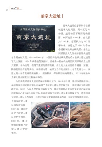 50%u6ed5TENGZHOUYINXIANG%u5dde%u5370%u8c61%u524d%u638c%u5927%u9057%u5740%u524d%u638c%u5927%u9057%u5740%u4f4d%u4e8e%u6ed5%u5dde%u5e02%u5b98%u6865%u9547%u524d%u638c%u5927%u6751%u5468%u56f4%uff0c%u8ddd%u5e02%u533a%u7ea6 25%u516c%u91cc%u3002%u9057%u5740%u7565%u5448%u4e0d%u89c4%u5219%u7684%u692d%u5706%u5f62%uff0c%u4e1c%u897f%u5bbd%u7ea6 1100 %u7c73%uff0c%u5357%u5317%u957f%u7ea6 2250 %u7c73%uff0c%u603b%u9762%u79ef%u7ea6%u4e3a 250 %u4e07%u5e73%u65b9%u7c73%u3002%u8be5%u9057%u5740%u4e8e 1964 %u5e74%u6625%u7531%u4e2d%u56fd%u79d1%u5b66%u9662%u8003%u53e4%u7814%u7a76%u6240%u5c71%u4e1c%u961f%u4f1a%u540c%u539f%u6ed5%u53bf%u6587%u5316%u9986%u5728%u6ed5%u53bf%u5883%u5185%u8fdb%u884c%u8003%u53e4%u8c03%u67e5%u65f6%u53d1%u73b0%u30021981%u20142001 %u5e74%uff0c%u4e2d%u56fd%u793e%u79d1%u9662%u8003%u53e4%u7814%u7a76%u6240%u5148%u540e%u5bf9%u524d%u638c%u5927%u9057%u5740%u8fdb%u884c%u4e86%u4e5d%u6b21%u53d1%u6398%u30021994 %u5e74%u79cb%u5b63%u8fdb%u884c%u53d1%u6398%u65f6%uff0c%u6e05%u7406%u51fa%u4e00%u6279%u5546%u4ee3%u665a%u671f%u81f3%u897f%u5468%u65e9%u671f%u7684%u571f%u5751%u7ad6%u7a74%u5893%u846c%u3001%u8f66%u9a6c%u5751%u7b49%uff0c%u83b7%u5f97%u4e86%u91cd%u8981%u7684%u5893%u846c%u8d44%u6599%uff0c%u51fa%u571f%u7684%u5927%u91cf%u7cbe%u7f8e%u7684%u9752%u94dc%u5668%u3001%u7389%u5668%u3001%u9676%u5668%u53ca%u539f%u59cb%u9752%u74f7%u7b49%u5b9e%u7269%uff0c%u4eab%u8a89%u56fd%u5185%u5916%uff0c%u88ab%u8bc4%u4e3a%u5f53%u5e74%u7684%u5168%u56fd%u5341%u5927%u8003%u53e4%u53d1%u73b0%u4e4b%u4e00%u3002%u8be5%u9057%u5740%u662f%u5c71%u4e1c%u7701%u53d1%u73b0%u7684%u89c4%u6a21%u8f83%u5927%u3001%u89c4%u683c%u8f83%u9ad8%u3001%u4fdd%u5b58%u8f83%u597d%u7684%u5546%u5468%u9057%u5740%uff0c2013 %u5e74%u88ab%u516c%u5e03%u4e3a%u7b2c%u4e03%u6279%u5168%u56fd%u91cd%u70b9%u6587%u7269%u4fdd%u62a4%u5355%u4f4d%u3002%u4e3a%u5207%u5b9e%u505a%u597d%u524d%u638c%u5927%u9057%u5740%u7684%u4fdd%u62a4%u548c%u5c55%u793a%u5de5%u4f5c%uff0c2013 %u5e74 5 %u6708%uff0c%u6ed5%u5dde%u5e02%u59d4%u6258%u6e05%u534e%u5927%u5b66%u5efa%u7b51%u8bbe%u8ba1%u7814%u7a76%u9662%u6709%u9650%u516c%u53f8%u7f16%u5236%u4e86%u300a%u524d%u638c%u5927%u9057%u5740%u4fdd%u62a4%u89c4%u5212%u300b%uff0c%u5e76%u83b7%u56fd%u5bb6%u6587%u7269%u5c40%u6279%u51c6%u7acb%u9879%u3002%u540c%u65f6%uff0c%u4e3a%u914d%u5408%u4fdd%u62a4%u89c4%u5212%u7f16%u5236%u5de5%u4f5c%uff0c%u6ed5%u5dde%u5e02%u59d4%u6258%u5c71%u4e1c%u6d77%u5cb1%u6587%u5316%u9057%u4ea7%u4fdd%u62a4%u54a8%u8be2%u670d%u52a1%u4e2d%u5fc3%u4e8e 2013 %u5e74%u81f3 2014 %u5e74%u7ec4%u7ec7%u5b9e%u65bd%u4e86%u524d%u638c%u5927%u9057%u5740%u8003%u53e4%u52d8%u63a2%u5de5%u4f5c%uff0c%u57fa%u672c%u6478%u6e05%u4e86%u524d%u638c%u5927%u9057%u5740%u5206%u5e03%u8303%u56f4%u3001%u5206%u5e03%u72b6%u51b5%u4ee5%u53ca%u91cd%u8981%u9057%u8ff9%u529f%u80fd%u5e03%u5c40%u3001%u5206%u5e03%u8303%u56f4%u7b49%u57fa%u672c%u4fe1%u606f%u3002%u4e3a%u52a0%u5f3a%u524d%u638c%u5927%u9057%u5740%u7684%u4fdd%u62a4%u529b%u5ea6%uff0c2013 %u5e74%uff0c%u6ed5%u5dde%u5e02%u8bbe%u7acb%u4e86%u524d%u638c%u5927%u9057%u5740%u4fdd%u62a4%u7ba1%u7406%u6240%uff1b2019 %u5e74%uff0c %u6ed5 %u5dde%u5e02%u7ec4%u7ec7%u5b9e%u65bd%u4e86%u524d%u638c%u5927%u9057%u5740%u5b89%u9632%u5de5%u7a0b%u3002