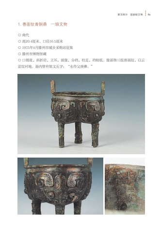 %u7b2c%u4e94%u90e8%u5206 %u56fd%u5bb6%u7ea7%u6587%u7269 611. %u517d%u9762%u7eb9%u9752%u94dc%u9f0e %u4e00%u7ea7%u6587%u7269%u25cb %u5546%u4ee3%u25cb %u9ad820.4%u5398%u7c73%u3001%u53e3%u5f8416.5%u5398%u7c73%u25cb 1975%u5e744%u6708%u6ed5%u5dde%u5e02%u57ce%u4e61%u91c7%u8d2d%u7ad9%u5f81%u96c6%u25cb %u6ed5%u5dde%u5e02%u535a%u7269%u9986%u85cf%u25cb %u53e3%u5fae%u655b%uff0c%u659c%u6298%u6cbf%uff0c%u7acb%u8033%uff0c%u9f13%u8179%uff0c%u5206%u88c6%uff0c%u67f1%u8db3%uff0c%u88c6%u8f83%u4f4e%u3002%u8179%u90e8%u9970%u4e09%u7ec4%u517d%u9762%u7eb9%uff0c%u4ee5%u4e91%u96f7%u7eb9%u886c%u5730%u3002%u5668%u5185%u58c1%u6709%u94ed%u6587%u4e94%u5b57%uff1a%u201c%u6c38%u4f5c%u7236%u5e9a%u5f5d%u3002%u201d