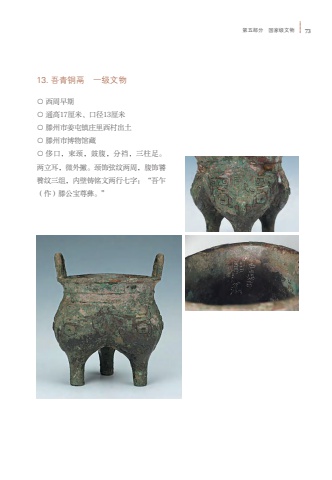 %u7b2c%u4e94%u90e8%u5206 %u56fd%u5bb6%u7ea7%u6587%u7269 7313. %u543e%u9752%u94dc%u9b32 %u4e00%u7ea7%u6587%u7269%u25cb %u897f%u5468%u65e9%u671f%u25cb %u901a%u9ad817%u5398%u7c73%u3001%u53e3%u5f8413%u5398%u7c73%u25cb %u6ed5%u5dde%u5e02%u59dc%u5c6f%u9547%u5e84%u91cc%u897f%u6751%u51fa%u571f%u25cb %u6ed5%u5dde%u5e02%u535a%u7269%u9986%u85cf%u25cb %u4f88%u53e3%uff0c%u675f%u9888%uff0c%u9f13%u8179%uff0c%u5206%u88c6%uff0c%u4e09%u67f1%u8db3%u3002%u4e24%u7acb%u8033%uff0c%u5fae%u5916%u6487%u3002%u9888%u9970%u5f26%u7eb9%u4e24%u5468%uff0c%u8179%u9970%u9955%u992e%u7eb9%u4e09%u7ec4%uff0c%u5185%u58c1%u94f8%u94ed%u6587%u4e24%u884c%u4e03%u5b57%uff1a%u201c%u543e%u4e4d%uff08%u4f5c%uff09%u6ed5%u516c%u5b9d%u5c0a%u5f5d%u3002%u201d
