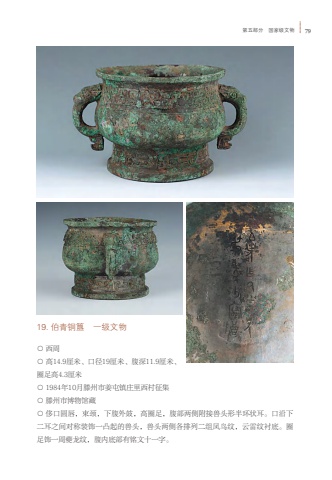%u7b2c%u4e94%u90e8%u5206 %u56fd%u5bb6%u7ea7%u6587%u7269 7919. %u4f2f%u9752%u94dc%u7c0b %u4e00%u7ea7%u6587%u7269%u25cb %u897f%u5468%u25cb %u9ad814.9%u5398%u7c73%u3001%u53e3%u5f8419%u5398%u7c73%u3001%u8179%u6df111.9%u5398%u7c73%u3001%u5708%u8db3%u9ad84.3%u5398%u7c73%u25cb 1984%u5e7410%u6708%u6ed5%u5dde%u5e02%u59dc%u5c6f%u9547%u5e84%u91cc%u897f%u6751%u5f81%u96c6%u25cb %u6ed5%u5dde%u5e02%u535a%u7269%u9986%u85cf%u25cb %u4f88%u53e3%u5706%u5507%uff0c%u675f%u9888%uff0c%u4e0b%u8179%u5916%u9f13%uff0c%u9ad8%u5708%u8db3%uff0c%u8179%u90e8%u4e24%u4fa7%u9644%u63a5%u517d%u5934%u5f62%u534a%u73af%u72b6%u8033%u3002%u53e3%u6cbf%u4e0b%u4e8c%u8033%u4e4b%u95f4%u5bf9%u79f0%u88c5%u9970%u4e00%u51f8%u8d77%u7684%u517d%u5934%uff0c%u517d%u5934%u4e24%u4fa7%u5404%u6392%u5217%u4e8c%u7ec4%u51e4%u9e1f%u7eb9%uff0c%u4e91%u96f7%u7eb9%u886c%u5e95%u3002%u5708%u8db3%u9970%u4e00%u5468%u5914%u9f99%u7eb9%uff0c%u8179%u5185%u5e95%u90e8%u6709%u94ed%u6587%u5341%u4e00%u5b57%u3002
