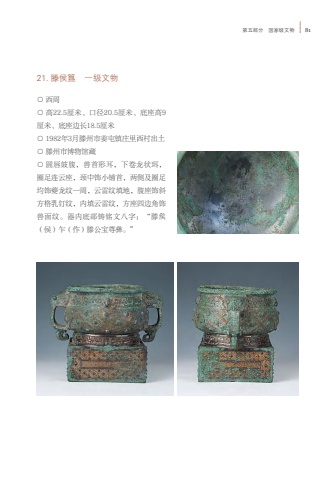 %u7b2c%u4e94%u90e8%u5206 %u56fd%u5bb6%u7ea7%u6587%u7269 8121. %u6ed5%u4faf%u7c0b %u4e00%u7ea7%u6587%u7269%u25cb %u897f%u5468%u25cb %u9ad822.5%u5398%u7c73%u3001%u53e3%u5f8420.5%u5398%u7c73%u3001%u5e95%u5ea7%u9ad89%u5398%u7c73%u3001%u5e95%u5ea7%u8fb9%u957f18.5%u5398%u7c73%u25cb 1982%u5e743%u6708%u6ed5%u5dde%u5e02%u59dc%u5c6f%u9547%u5e84%u91cc%u897f%u6751%u51fa%u571f%u25cb %u6ed5%u5dde%u5e02%u535a%u7269%u9986%u85cf%u25cb %u5706%u5507%u9f13%u8179%uff0c%u517d%u9996%u5f62%u8033%uff0c%u4e0b%u5377%u9f99%u72b6%u73e5%uff0c%u5708%u8db3%u8fde%u4e91%u5ea7%uff0c%u9888%u4e2d%u9970%u5c0f%u94fa%u9996%uff0c%u4e24%u4fa7%u53ca%u5708%u8db3%u5747%u9970%u5914%u9f99%u7eb9%u4e00%u5468%uff0c%u4e91%u96f7%u7eb9%u586b%u5730%uff0c%u8179%u5ea7%u9970%u659c%u65b9%u683c%u4e73%u9489%u7eb9%uff0c%u5185%u586b%u4e91%u96f7%u7eb9%uff0c%u65b9%u5ea7%u56db%u8fb9%u89d2%u9970%u517d%u9762%u7eb9%u3002%u5668%u5185%u5e95%u90e8%u94f8%u94ed%u6587%u516b%u5b57%uff1a%u201c%u6ed5%u77e6%uff08%u4faf%uff09%u4e4d%uff08%u4f5c%uff09%u6ed5%u516c%u5b9d%u5c0a%u5f5d%u3002%u201d