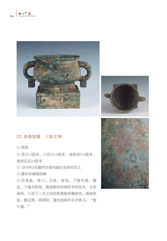 82%u6ed5TENGZHOUYINXIANG%u5dde%u5370%u8c6122. %u65b0%u9752%u94dc%u7c0b %u4e09%u7ea7%u6587%u7269%u25cb %u897f%u5468%u25cb %u9ad816.5%u5398%u7c73%u3001%u53e3%u5f8415.5%u5398%u7c73%u3001%u5e95%u5ea7%u9ad85.3%u5398%u7c73%u3001%u5e95%u5ea7%u8fb9%u957f14%u5398%u7c73%u25cb 1978%u5e743%u6708%u6ed5%u5dde%u5e02%u59dc%u5c6f%u9547%u5e84%u91cc%u897f%u6751%u51fa%u571f%u25cb %u6ed5%u5dde%u5e02%u535a%u7269%u9986%u85cf%u25cb %u996a%u98df%u5668%u3002%u4f88%u53e3%uff0c%u65b9%u5507%uff0c%u675f%u9888%uff0c%u4e0b%u8179%u5916%u9f13%uff0c%u5708%u8db3%uff0c%u4e0b%u63a5%u65b9%u5f62%u5ea7%u3002%u8179%u90e8%u9644%u5bf9%u79f0%u517d%u5f62%u534a%u73af%u72b6%u8033%u3001%u65b9%u5f62%u5782%u73e5%u3002%u53e3%u6cbf%u4e0b%u4e8c%u8033%u4e4b%u95f4%u5bf9%u79f0%u88c5%u9970%u6d6e%u96d5%u517d%u9996%uff0c%u4e24%u5468%u5f26%u7eb9%u3002%u5708%u8db3%u9970%u4e00%u5468%u5f26%u7eb9%u3002%u8179%u5185%u5e95%u90e8%u6709%u4e94%u5b57%u94ed%u6587%uff1a%u201c%u65b0%u4e4d%u7c0b%u3002%u201d