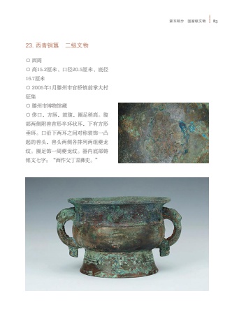 %u7b2c%u4e94%u90e8%u5206 %u56fd%u5bb6%u7ea7%u6587%u7269 8323. %u897f%u9752%u94dc%u7c0b %u4e8c%u7ea7%u6587%u7269%u25cb %u897f%u5468%u25cb %u9ad815.2%u5398%u7c73%u3001%u53e3%u5f8420.5%u5398%u7c73%u3001%u5e95%u5f8416.7%u5398%u7c73%u25cb 2005%u5e741%u6708%u6ed5%u5dde%u5e02%u5b98%u6865%u9547%u524d%u638c%u5927%u6751%u5f81%u96c6%u25cb %u6ed5%u5dde%u5e02%u535a%u7269%u9986%u85cf%u25cb %u4f88%u53e3%uff0c%u65b9%u5507%uff0c%u9f13%u8179%uff0c%u5708%u8db3%u7a0d%u9ad8%u3002%u8179%u90e8%u4e24%u4fa7%u9644%u517d%u9996%u5f62%u534a%u73af%u72b6%u8033%uff0c%u4e0b%u6709%u65b9%u5f62%u5782%u73e5%u3002%u53e3%u6cbf%u4e0b%u4e24%u8033%u4e4b%u95f4%u5bf9%u79f0%u88c5%u9970%u4e00%u51f8%u8d77%u7684%u517d%u5934%uff0c%u517d%u5934%u4e24%u4fa7%u5404%u6392%u5217%u4e24%u7ec4%u5914%u9f99%u7eb9%u3002%u5708%u8db3%u9970%u4e00%u5468%u5914%u9f99%u7eb9%u3002%u5668%u5185%u5e95%u90e8%u94f8%u94ed%u6587%u4e03%u5b57%uff1a%u201c%u897f%u4f5c%u7236%u4e01 %u5f5d%u53f2%u3002%u201d