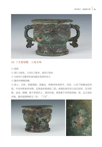 %u7b2c%u4e94%u90e8%u5206 %u56fd%u5bb6%u7ea7%u6587%u7269 8525. %u4e01%u5144%u9752%u94dc%u7c0b %u4e09%u7ea7%u6587%u7269%u25cb %u897f%u5468%u25cb %u9ad817.2%u5398%u7c73%u3001%u53e3%u5f8421.3%u5398%u7c73%u3001%u5e95%u5f8417%u5398%u7c73%u25cb 1989%u5e741%u6708%u6ed5%u5dde%u5e02%u59dc%u5c6f%u9547%u5e84%u91cc%u897f%u6751%u51fa%u571f%u25cb %u6ed5%u5dde%u5e02%u535a%u7269%u9986%u85cf%u25cb %u4f88%u53e3%uff0c%u65b9%u5507%uff0c%u6df1%u8179%u5fae%u9f13%uff0c%u9ad8%u5708%u8db3%u3002%u4e24%u4fa7%u5bf9%u79f0%u517d%u5f62%u8033%uff0c%u51e4%u73e5%u3002%u53e3%u6cbf%u4e0b%u9970%u5914%u9f99%u7eb9%u56db%u7ec4%uff0c%u4e2d%u6709%u5bf9%u79f0%u517d%u9996%u7a81%u9970%uff0c%u8db3%u9970%u8fde%u4f53%u517d%u9762%u7eb9%u4e8c%u7ec4%uff1b%u517d%u9762%u7eb9%u89d2%u4f5c%u7ad6%u7acb%u7684%u4e91%u7eb9%u72b6%uff0c%u81e3%u5b57%u5f62%u773c%uff0c%u76f4%u9f3b%uff0c%u9614%u5634%uff0c%u8eaf%u5e72%u6298%u800c%u5411%u4e0a%uff0c%u5c3e%u5411%u5185%u5377%uff0c%u4e24%u6761%u8eaf%u5e72%u6709%u94a9%u72b6%u7684%u523a%uff0c%u9888%u3001%u8db3%u4e91%u96f7%u7eb9%u886c%u5730%u3002%u5668%u5185%u5e95%u90e8%u94f8%u94ed%u6587%u4e8c%u5b57%uff1a%u201c%u4e01%u5144%u201d%u3002