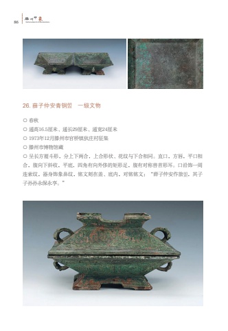 86%u6ed5TENGZHOUYINXIANG%u5dde%u5370%u8c6126. %u859b%u5b50%u4ef2%u5b89%u9752%u94dc %u4e00%u7ea7%u6587%u7269%u25cb %u6625%u79cb%u25cb %u901a%u9ad816.5%u5398%u7c73%u3001%u901a%u957f29%u5398%u7c73%u3001%u901a%u5bbd24%u5398%u7c73%u25cb 1973%u5e7412%u6708%u6ed5%u5dde%u5e02%u5b98%u6865%u9547%u72c4%u5e84%u6751%u5f81%u96c6%u25cb %u6ed5%u5dde%u5e02%u535a%u7269%u9986%u85cf%u25cb %u5448%u957f%u65b9%u8986%u6597%u5f62%uff0c%u5206%u4e0a%u4e0b%u4e24%u5408%uff0c%u4e0a%u5408%u5f62%u72b6%u3001%u82b1%u7eb9%u4e0e%u4e0b%u5408%u76f8%u540c%u3002%u76f4%u53e3%uff0c%u65b9%u5507%uff0c%u5e73%u53e3%u76f8%u5408%uff0c%u8179%u5411%u4e0b%u659c%u6536%uff0c%u5e73%u5e95%uff0c%u56db%u89d2%u6709%u5411%u5916%u4f88%u7684%u77e9%u5f62%u8db3%uff0c%u8179%u6709%u5bf9%u79f0%u517d%u9996%u5f62%u8033%u3002%u53e3%u6cbf%u9970%u4e00%u5468%u8fde%u7d22%u7eb9%uff0c%u5668%u8eab%u9970%u8c61%u9f3b%u7eb9%uff0c%u94ed%u6587%u523b%u5728%u76d6%u3001%u5e95%u5185%uff0c%u5bf9%u94ed%u94ed%u6587%uff1a%u201c%u859b%u5b50%u4ef2%u5b89%u4f5c%u65c5 %uff0c%u5176%u5b50%u5b50%u5b59%u5b59%u6c38%u4fdd%u6c38%u4eab%u3002%u201d