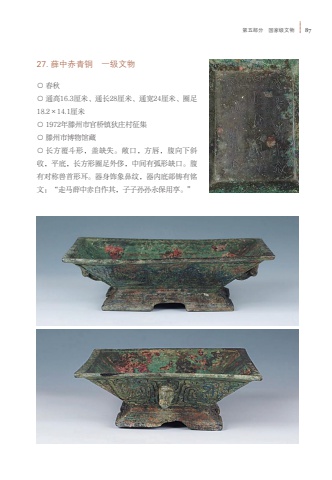 %u7b2c%u4e94%u90e8%u5206 %u56fd%u5bb6%u7ea7%u6587%u7269 8727. %u859b%u4e2d%u8d64%u9752%u94dc %u4e00%u7ea7%u6587%u7269%u25cb %u6625%u79cb%u25cb %u901a%u9ad816.3%u5398%u7c73%u3001%u901a%u957f28%u5398%u7c73%u3001%u901a%u5bbd24%u5398%u7c73%u3001%u5708%u8db318.2%u00d714.1%u5398%u7c73%u25cb 1972%u5e74%u6ed5%u5dde%u5e02%u5b98%u6865%u9547%u72c4%u5e84%u6751%u5f81%u96c6%u25cb %u6ed5%u5dde%u5e02%u535a%u7269%u9986%u85cf%u25cb %u957f%u65b9%u8986%u6597%u5f62%uff0c%u76d6%u7f3a%u5931%u3002%u655e%u53e3%uff0c%u65b9%u5507%uff0c%u8179%u5411%u4e0b%u659c%u6536%uff0c%u5e73%u5e95%uff0c%u957f%u65b9%u5f62%u5708%u8db3%u5916%u4f88%uff0c%u4e2d%u95f4%u6709%u5f27%u5f62%u7f3a%u53e3%u3002%u8179%u6709%u5bf9%u79f0%u517d%u9996%u5f62%u8033%u3002%u5668%u8eab%u9970%u8c61%u9f3b%u7eb9%uff0c%u5668%u5185%u5e95%u90e8%u94f8%u6709%u94ed%u6587%uff1a%u201c%u8d70%u9a6c%u859b%u4e2d%u8d64%u81ea%u4f5c%u5176%uff0c%u5b50%u5b50%u5b59%u5b59%u6c38%u4fdd%u7528%u4eab%u3002%u201d