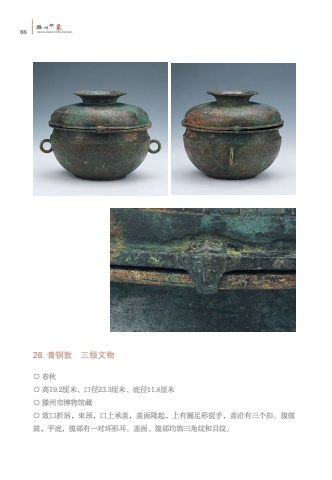 88%u6ed5TENGZHOUYINXIANG%u5dde%u5370%u8c6128. %u9752%u94dc%u6566 %u4e09%u7ea7%u6587%u7269%u25cb %u6625%u79cb%u25cb %u9ad819.2%u5398%u7c73%u3001%u53e3%u5f8423.3%u5398%u7c73%u3001%u5e95%u5f8411.8%u5398%u7c73%u25cb %u6ed5%u5dde%u5e02%u535a%u7269%u9986%u85cf%u25cb %u655b%u53e3%u6298%u5507%uff0c%u675f%u9888%uff0c%u53e3%u4e0a%u627f%u76d6%uff0c%u76d6%u9762%u9686%u8d77%uff0c%u4e0a%u6709%u5708%u8db3%u5f62%u6349%u624b%uff0c%u76d6%u6cbf%u6709%u4e09%u4e2a%u6263%u3002%u8179%u5fae%u9f13%uff0c%u5e73%u5e95%uff0c%u8179%u90e8%u6709%u4e00%u5bf9%u73af%u5f62%u8033%u3002%u76d6%u9762%u3001%u8179%u90e8%u5747%u9970%u4e09%u89d2%u7eb9%u548c%u76ee%u7eb9%u3002