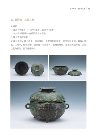 %u7b2c%u4e94%u90e8%u5206 %u56fd%u5bb6%u7ea7%u6587%u7269 8929. %u9752%u94dc%u6566 %u4e09%u7ea7%u6587%u7269%u25cb %u6218%u56fd%u25cb %u901a%u9ad819.8%u5398%u7c73%u3001%u53e3%u5f8422.5%u5398%u7c73%u3001%u5e95%u5f8414.2%u5398%u7c73%u25cb 1983%u5e745%u6708%u6ed5%u5dde%u5e02%u5b98%u6865%u9547%u575d%u4e0a%u6751%u5f81%u96c6%u25cb %u6ed5%u5dde%u5e02%u535a%u7269%u9986%u85cf%u25cb %u655b%u53e3%u6298%u5507%uff0c%u53e3%u4e0a%u627f%u76d6%uff0c%u76d6%u9762%u9686%u8d77%uff0c%u4e0a%u6709%u5708%u8db3%u5f62%u6349%u624b%uff0c%u76d6%u6cbf%u6709%u4e09%u4e2a%u6263%u3002%u9f13%u8179%uff0c%u571c%u5e95%uff0c%u4e09%u8db3%u5c0f%uff0c%u4f5c%u517d%u8e44%u5f62%uff0c%u8179%u90e8%u6709%u4e00%u5bf9%u73af%u5f62%u8033%u3002%u76d6%u9762%u9970%u9cde%u7eb9%uff0c%u8179%u4e0a%u90e8%u9970%u91cd%u73af%u7eb9%u3001%u4e91%u96f7%u7eb9%u53ca%u51f8%u5f26%u7eb9%uff0c%u8179%u4e0b%u90e8%u9970%u9cde%u7eb9%u3002