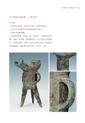 %u7b2c%u4e94%u90e8%u5206 %u56fd%u5bb6%u7ea7%u6587%u7269 9333. %u517d%u9762%u7eb9%u9752%u94dc%u7235 %u4e09%u7ea7%u6587%u7269%u25cb %u5546%u4ee3%u25cb %u901a%u9ad819.5%u5398%u7c73%u3001%u901a%u957f18.1%u5398%u7c73%u3001%u8179%u5f846.6%u5398%u7c73%u25cb 2001%u5e744%u6708%u6ed5%u5dde%u5e02%u5b98%u6865%u9547%u524d%u638c%u5927%u6751%u51fa%u571f%u25cb %u6ed5%u5dde%u5e02%u535a%u7269%u9986%u85cf%u25cb %u5375%u5706%u5f62%u6df1%u8179%uff0c%u571c%u5e95%uff0c%u6d41%u3001%u5c3e%u8f83%u957f%uff0c%u4e09%u68f1%u5f62%u5c16%u8db3%u5916%u6487%uff0c%u8179%u90e8%u4e00%u4fa7%u6709%u92ec%uff0c%u92ec%u9876%u9970%u517d%u5934%u3002%u6cbf%u4e0a%u7686%u76f4%u7acb%u4e24%u83cc%u72b6%u67f1%uff0c%u67f1%u9876%u9970%u6da1%u7eb9%u3002%u8179%u9970%u4e8c%u7ec4%u4ee5%u4e91%u96f7%u7eb9%u886c%u5730%u3001%u4ee5%u6249%u68f1%u4e3a%u9f3b%u7684%u9955%u992e%u7eb9%u3002%u92ec%u5185%u8179%u5916%u58c1%u4e0a%u94f8%u201c%u53e3%u7236%u5df2%u201d%u4e09%u5b57%u3002